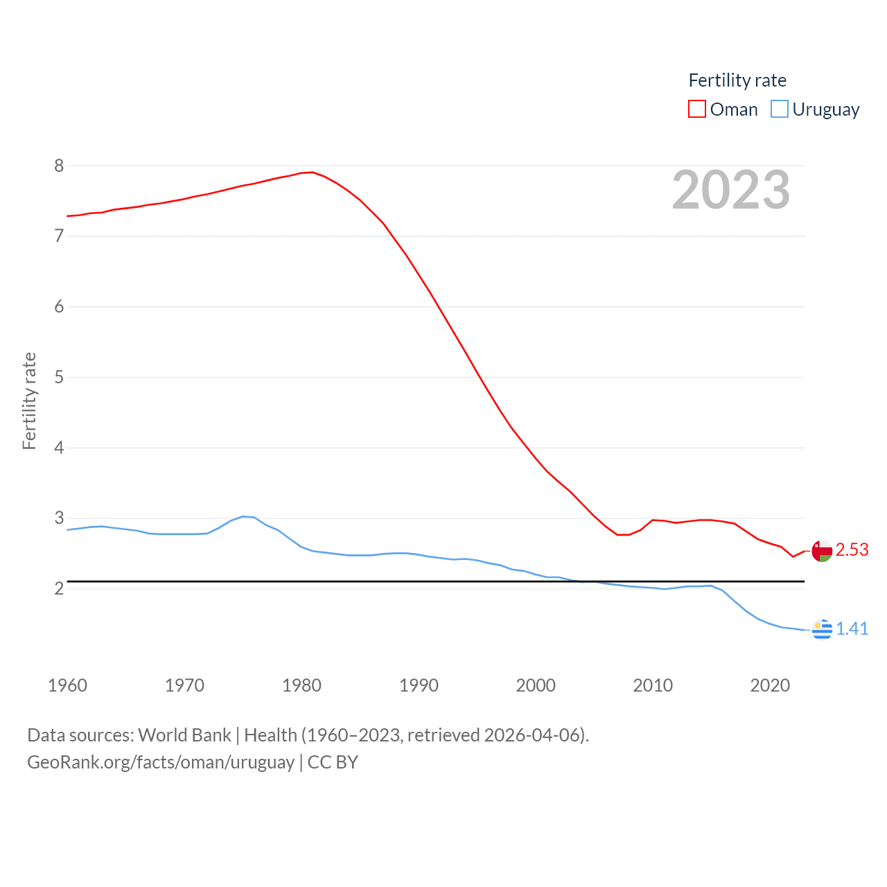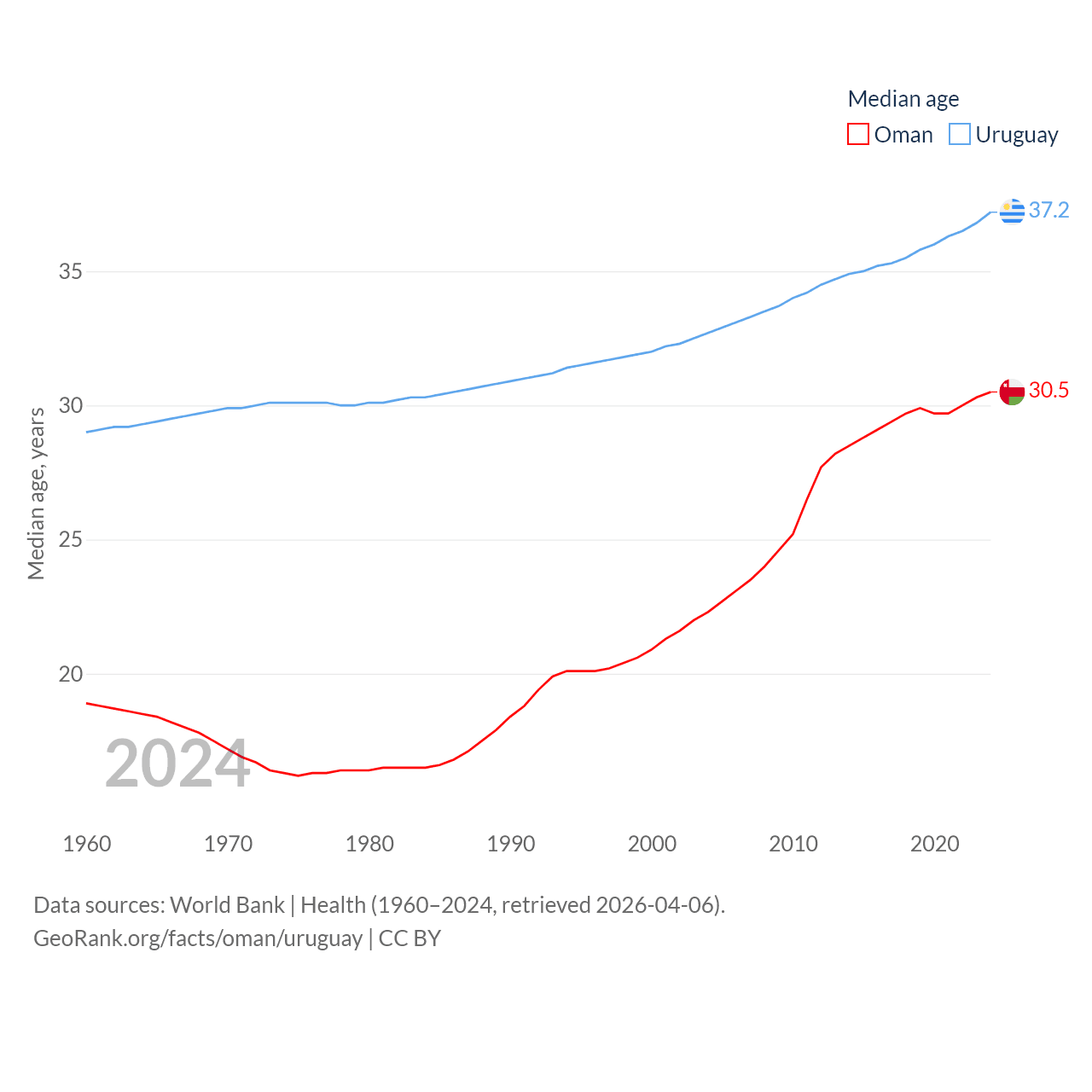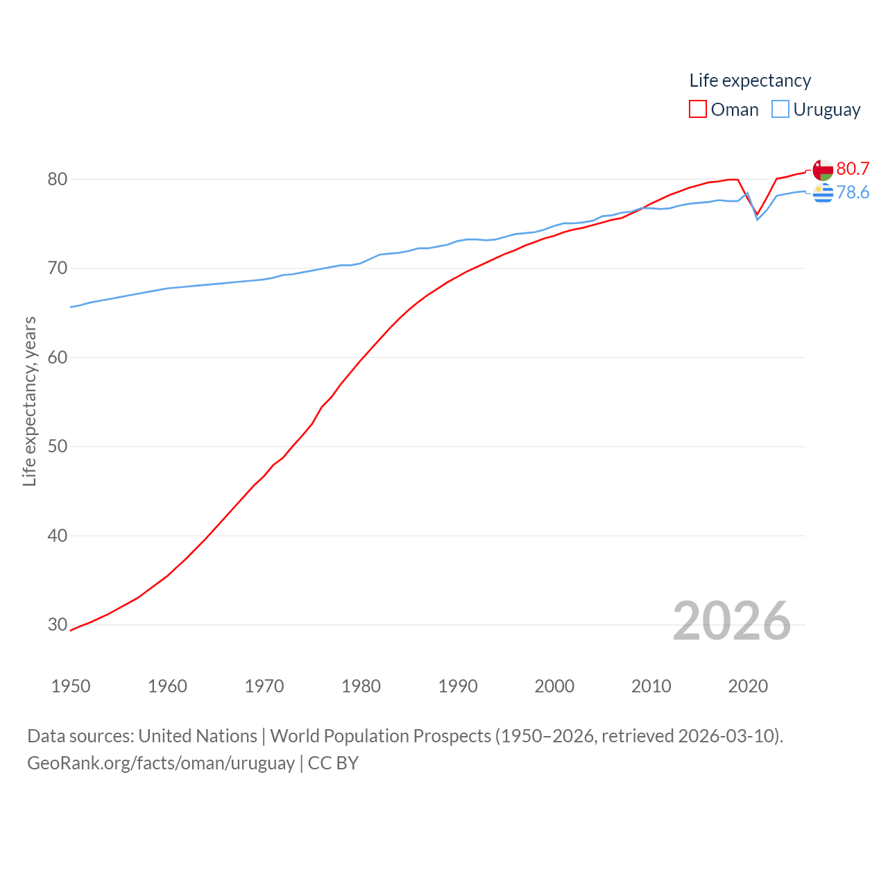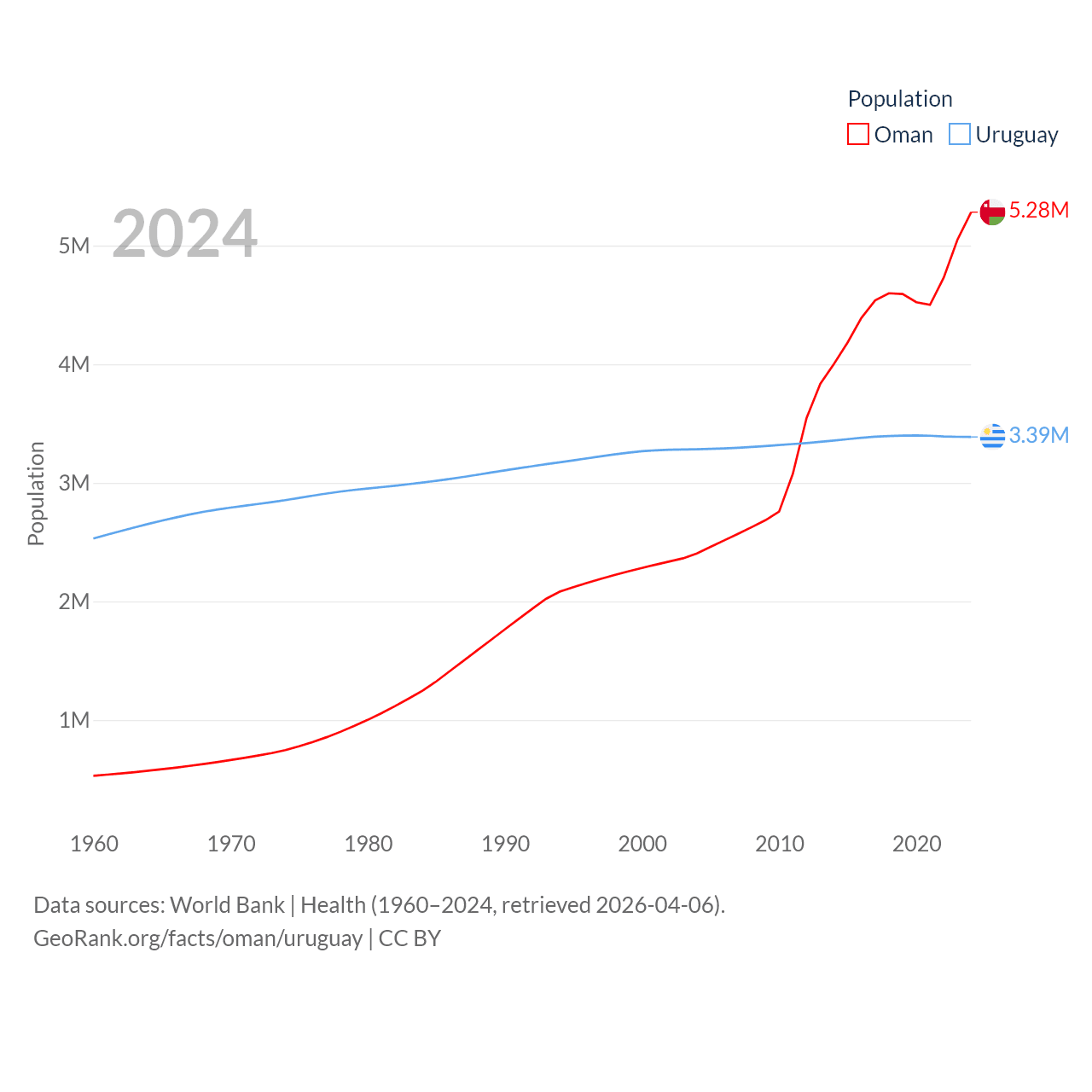 Oman has a population of 5.28M (ranked 124/197), compared with 3.39M in Uruguay (ranked 133/197). Oman's land area is 119,499 sq mi versus 67,576 sq mi for Uruguay (ranked 68th vs. 89th).