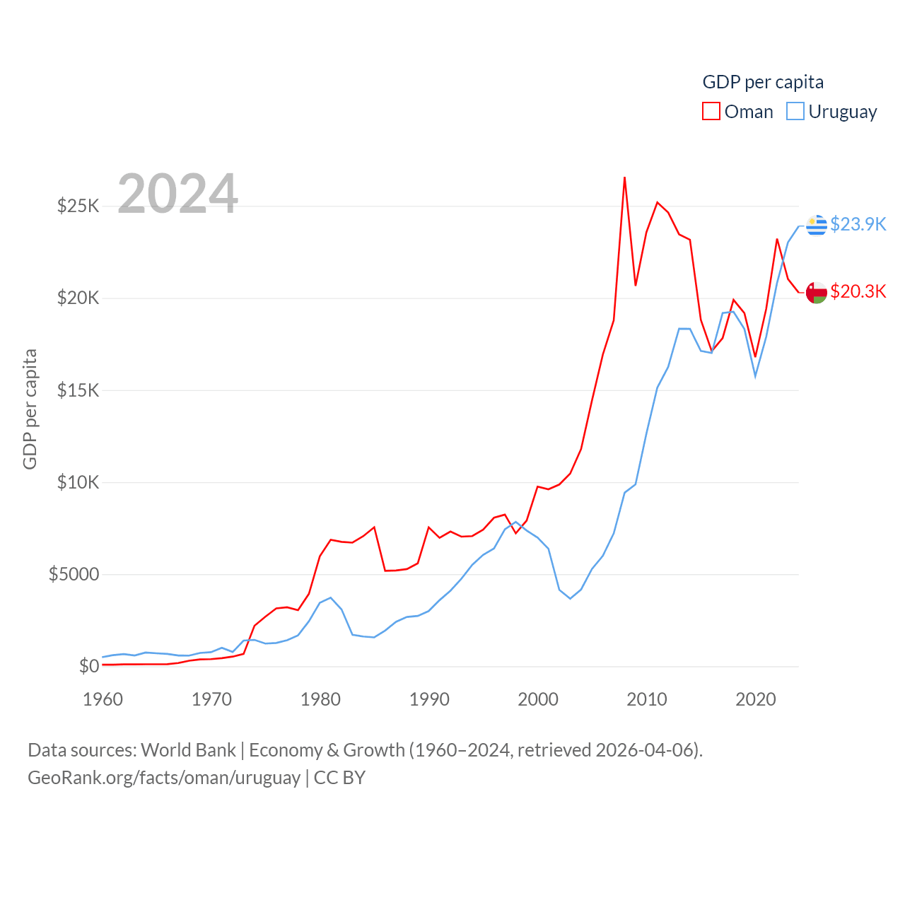 By GDP, Oman ranks 70/197 ($107B) and Uruguay ranks 81/197 ($81B). By GDP per capita, Oman ranks 57/197 ($20,285), while Uruguay ranks 52/197 ($23,907).