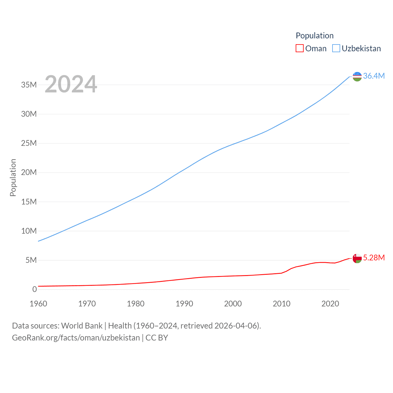 Oman has a population of 5.28M (ranked 124/197), compared with 36.4M in Uzbekistan (ranked 43/197). Oman's land area is 119,499 sq mi versus 170,136 sq mi for Uzbekistan (ranked 68th vs. 56th).
