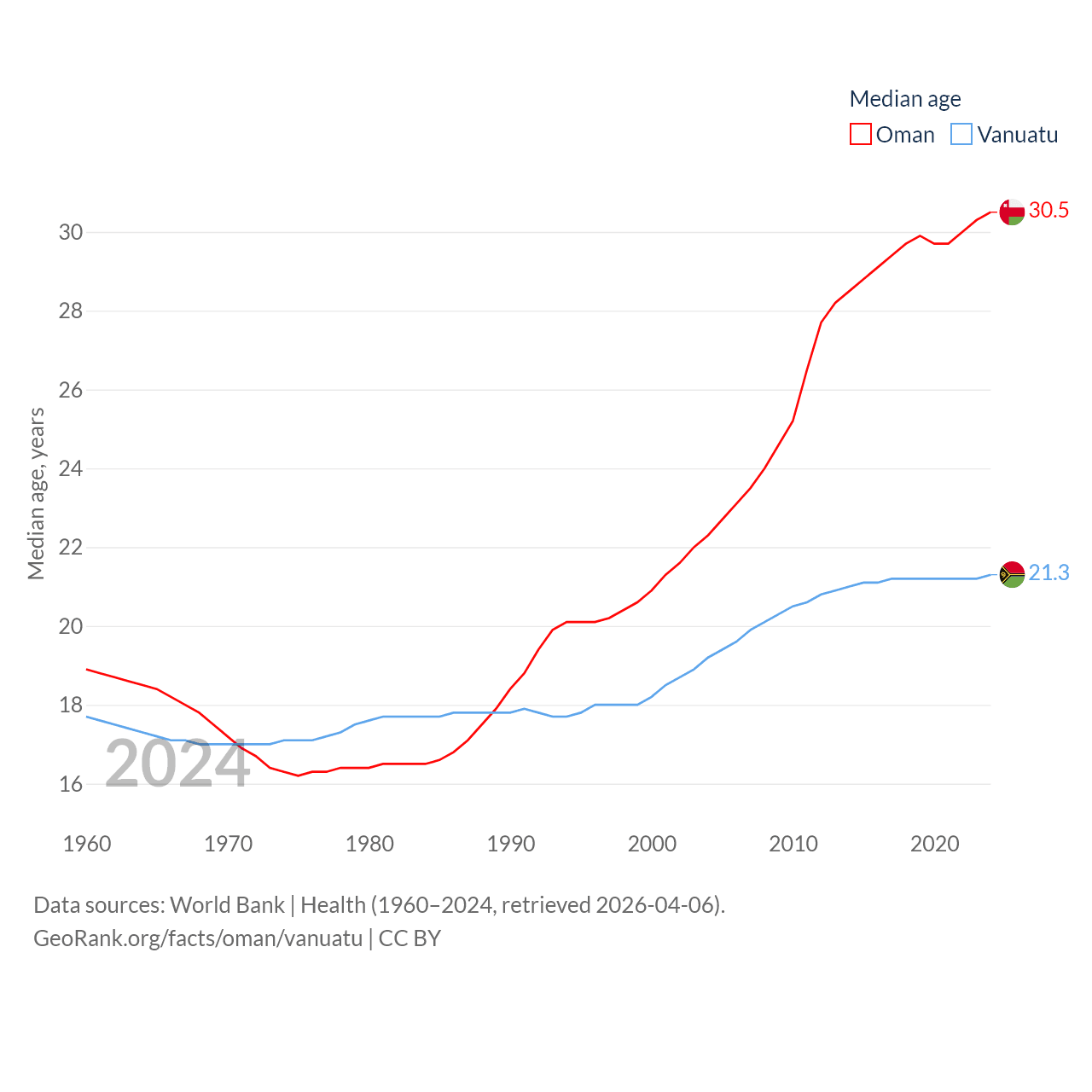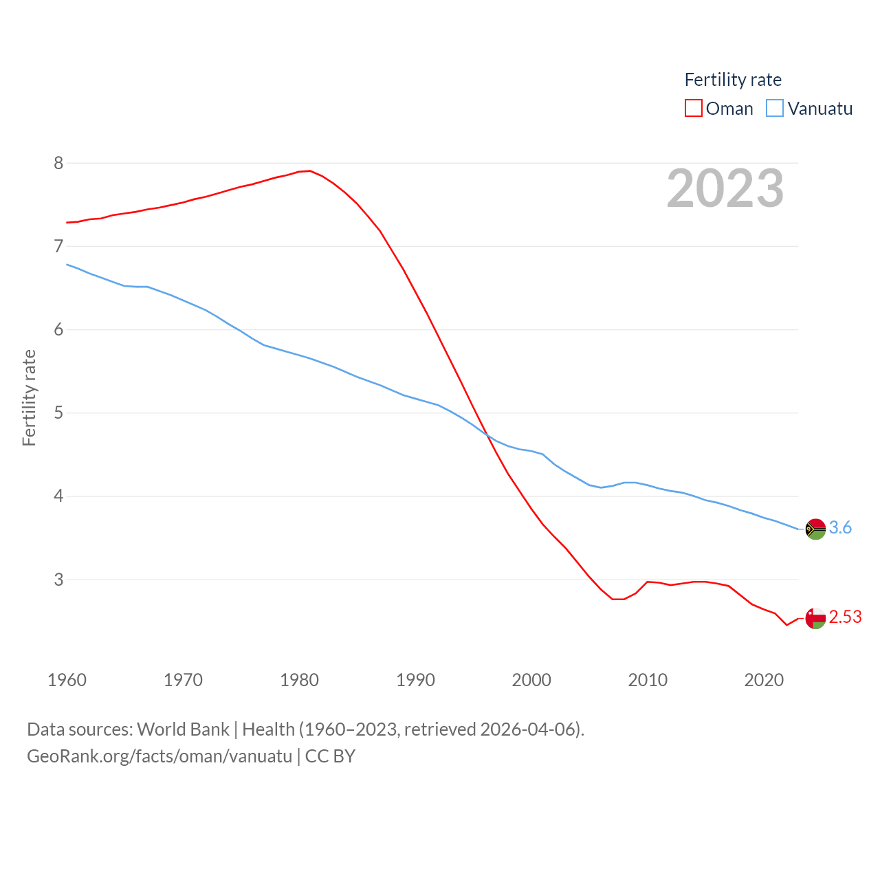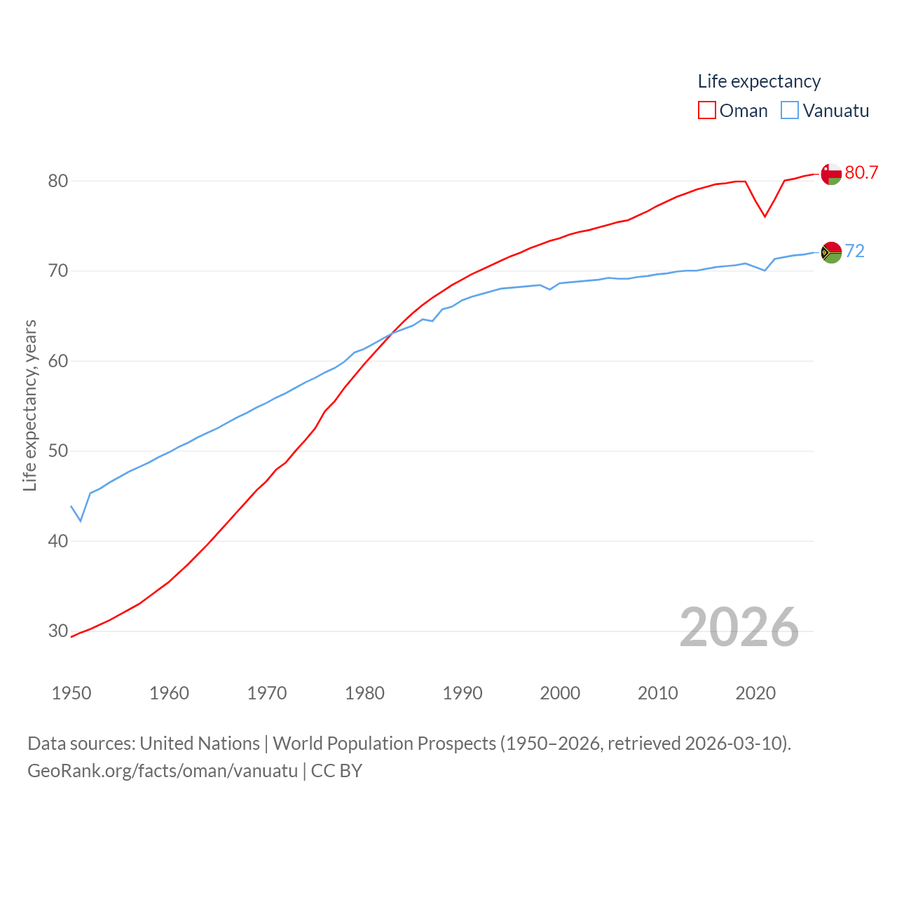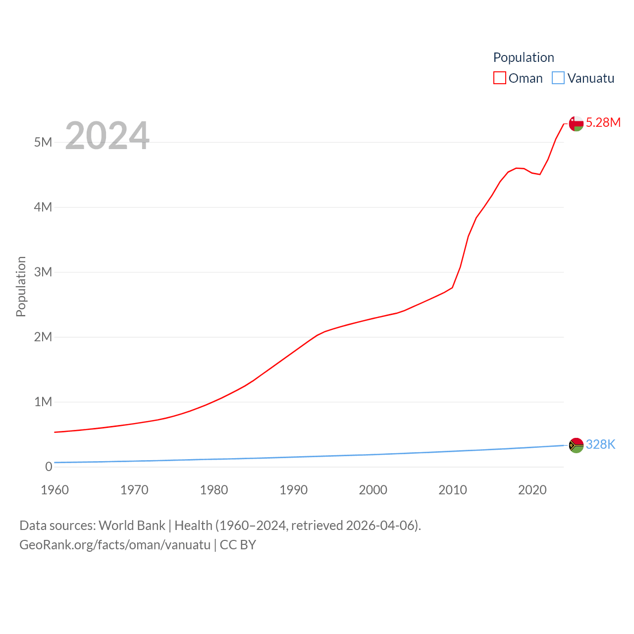 Oman has a population of 5.28M (ranked 124/197), compared with 328K in Vanuatu (ranked 174/197). Oman's land area is 119,499 sq mi versus 4,707 sq mi for Vanuatu (ranked 68th vs. 157th).