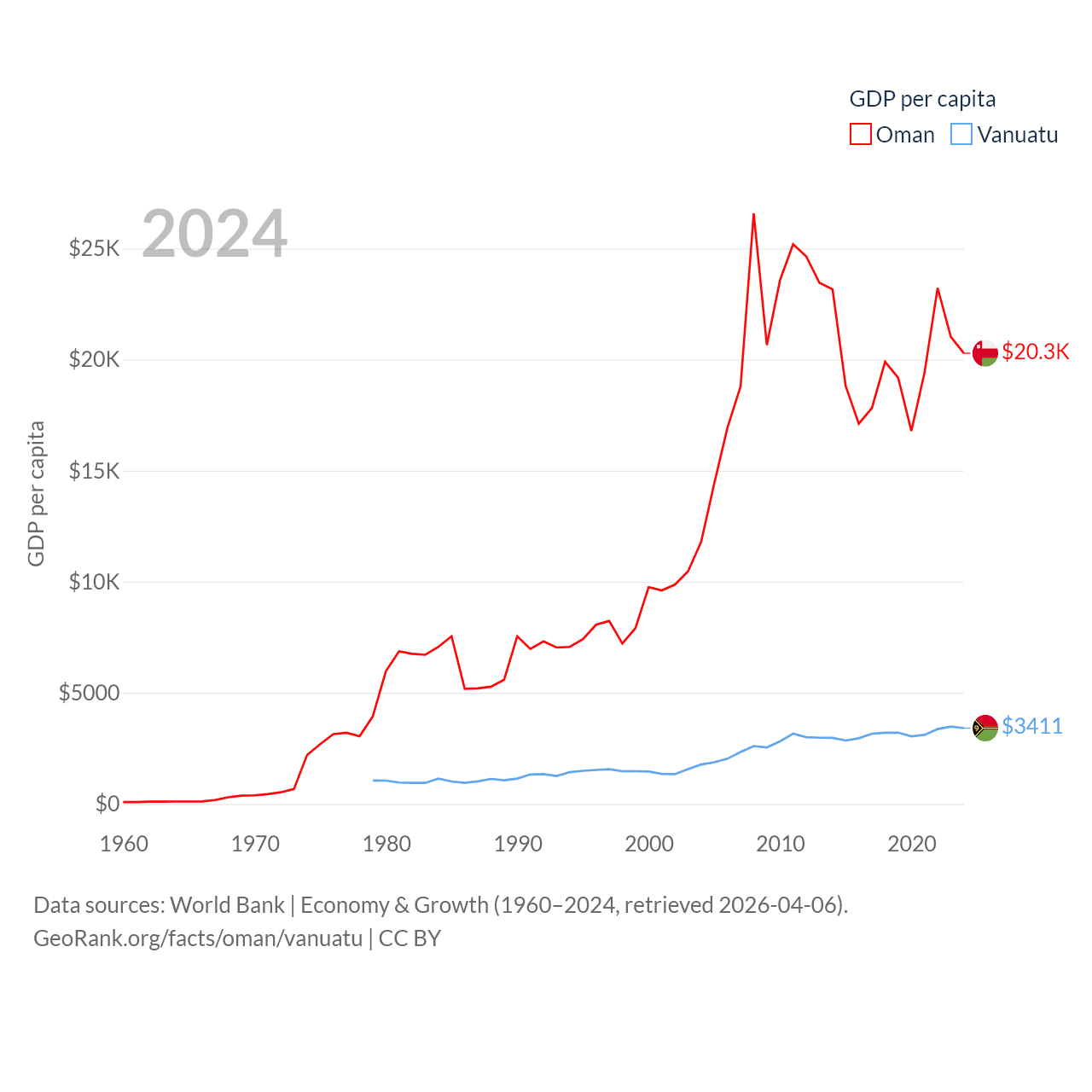 By GDP, Oman ranks 70/197 ($107B) and Vanuatu ranks 188/197 ($1.12B). By GDP per capita, Oman ranks 57/197 ($20,285), while Vanuatu ranks 137/197 ($3,411).