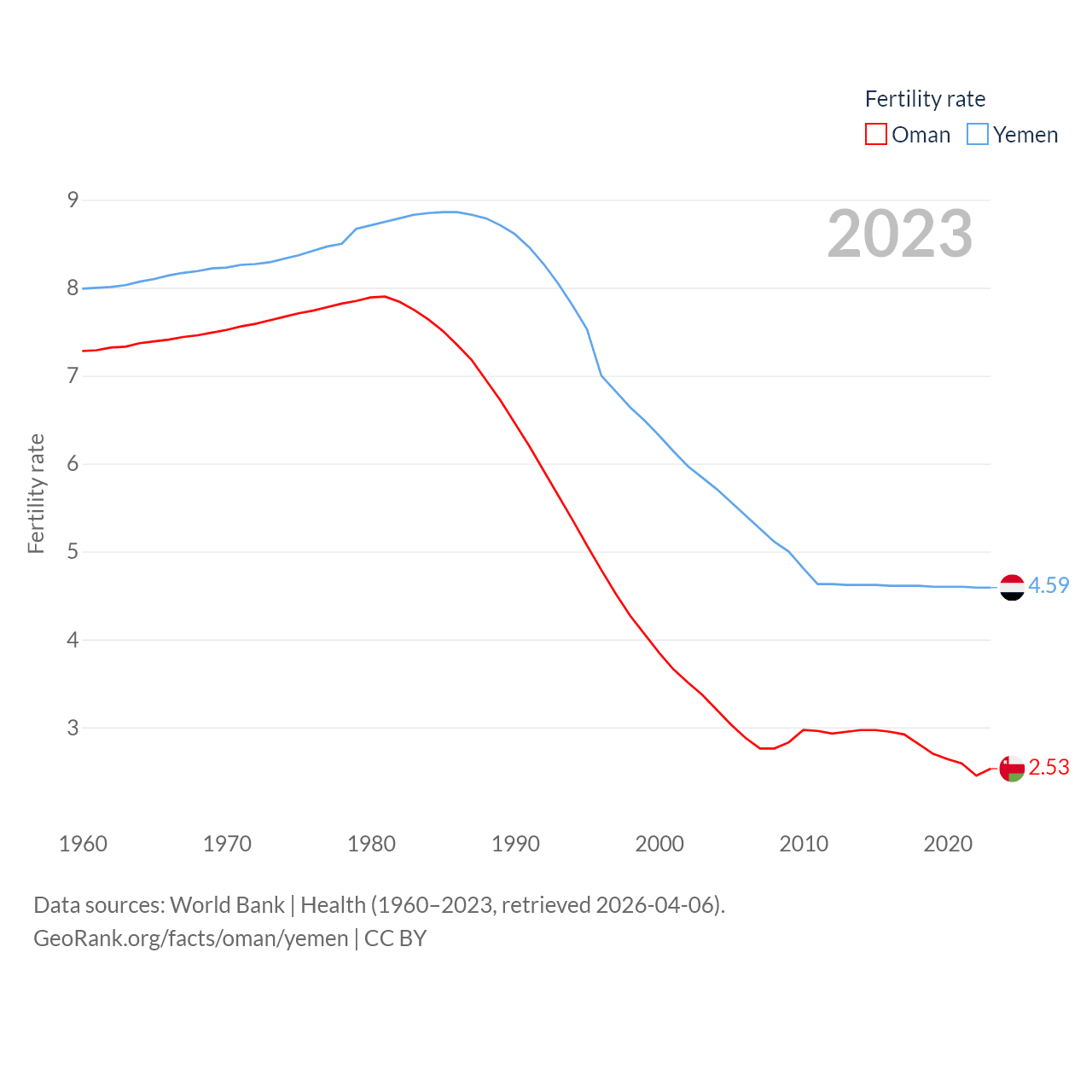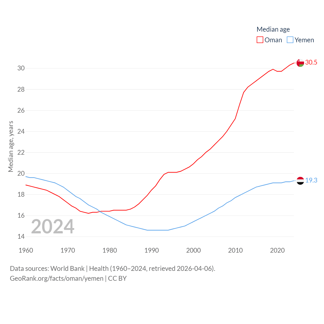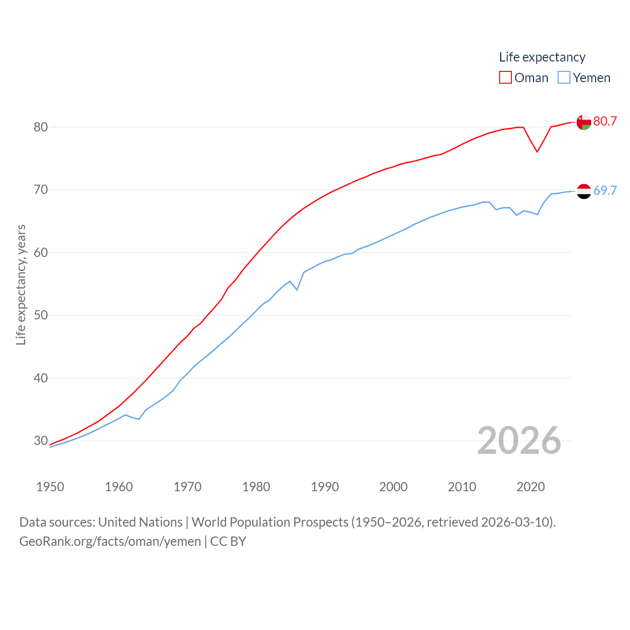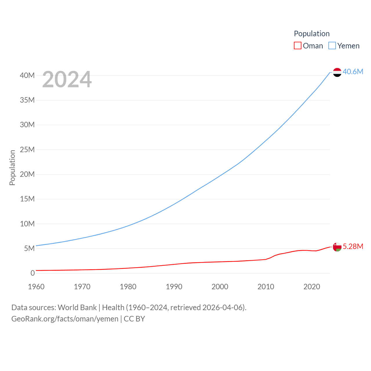 Oman has a population of 5.28M (ranked 124/197), compared with 40.6M in Yemen (ranked 38/197). Oman's land area is 119,499 sq mi versus 203,850 sq mi for Yemen (ranked 68th vs. 49th).