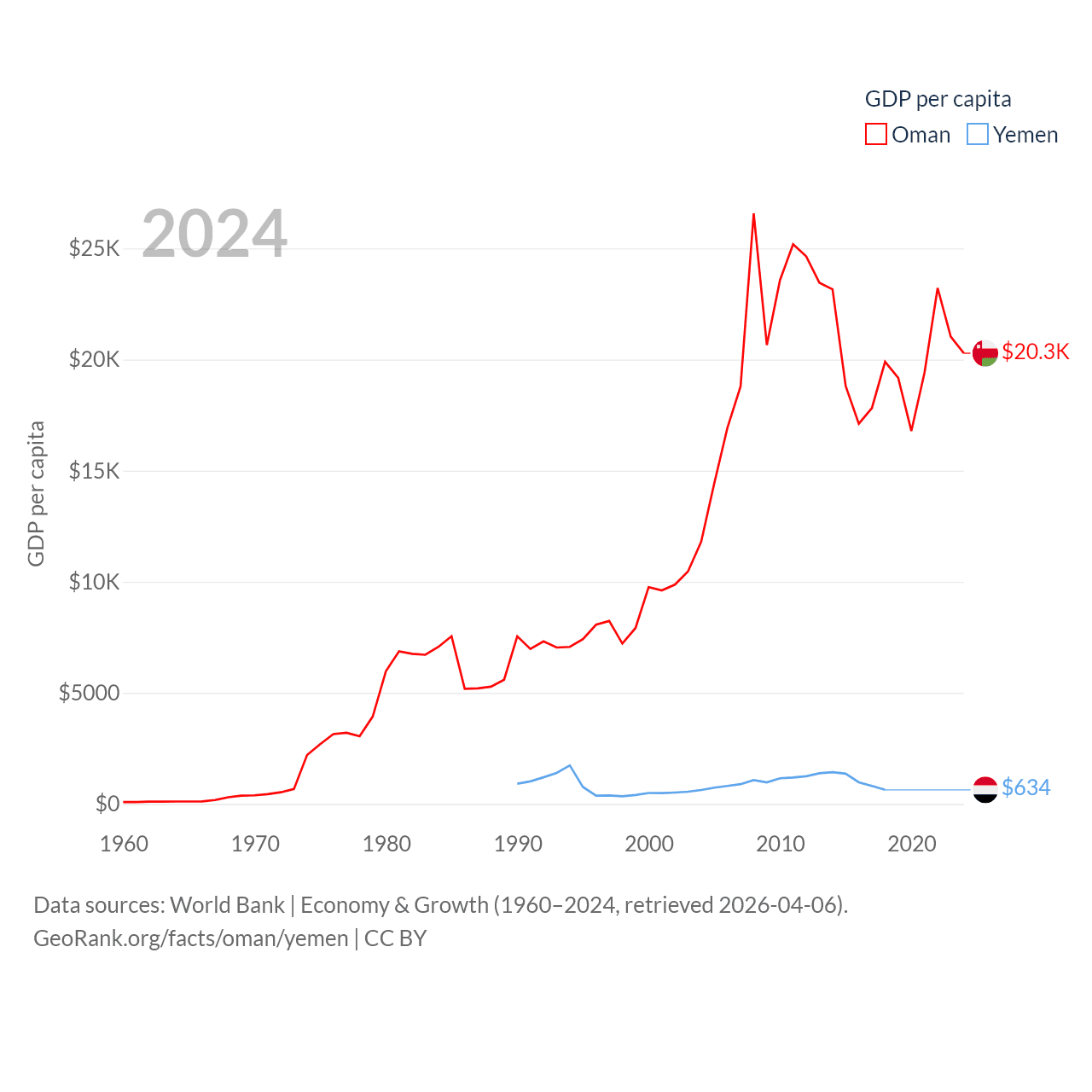 By GDP, Oman ranks 70/197 ($107B) and Yemen ranks 125/197 ($21.6B). By GDP per capita, Oman ranks 57/197 ($20,285), while Yemen ranks 191/197 ($634).