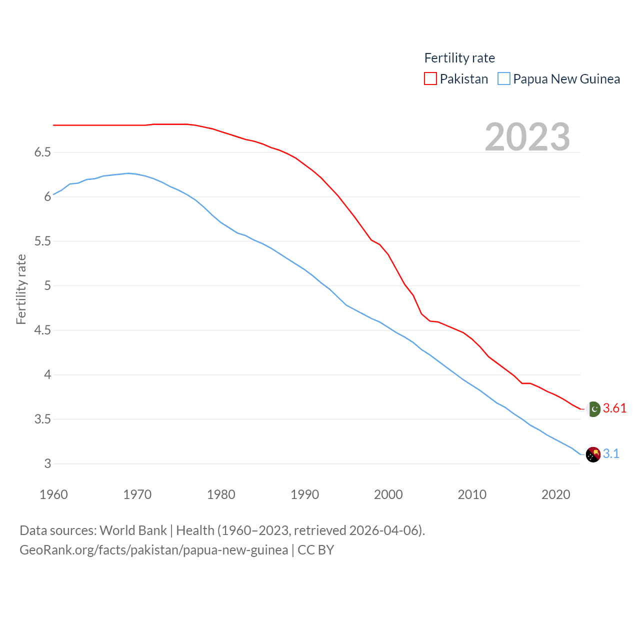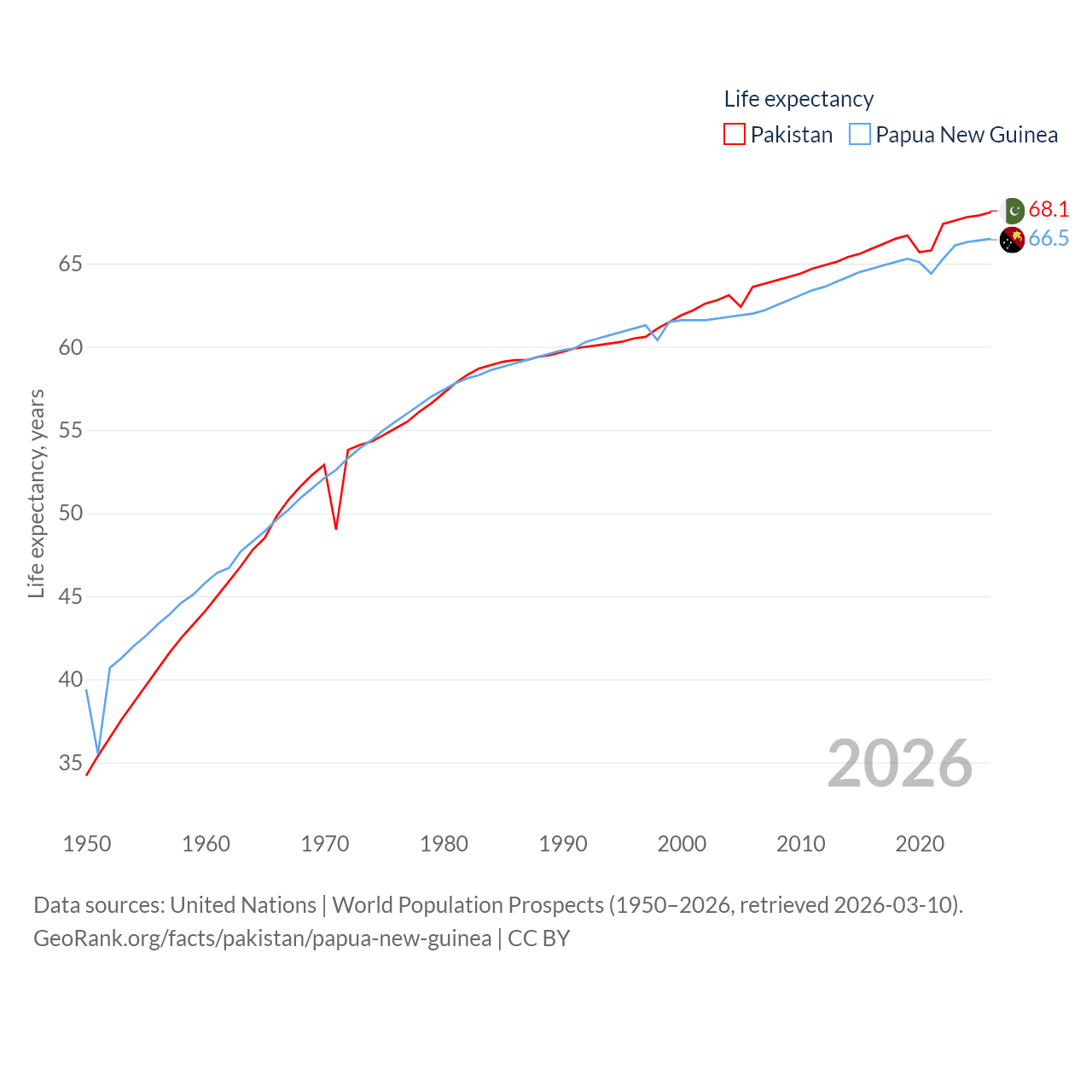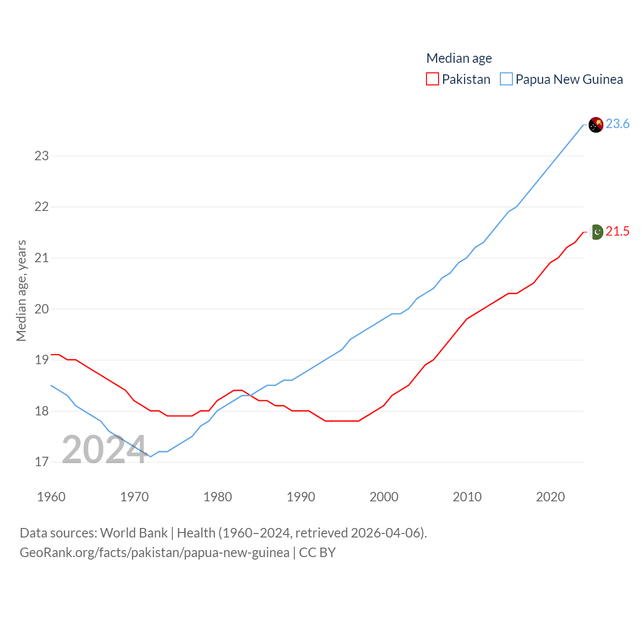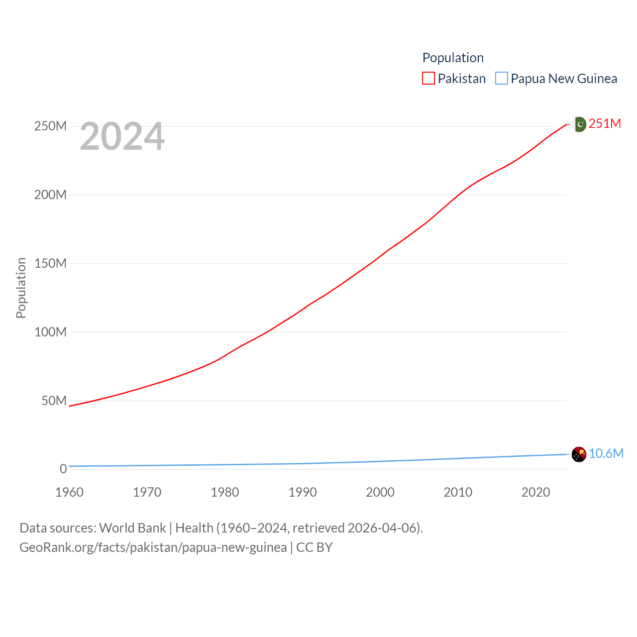 Pakistan has a population of 251M (ranked 5/197), compared with 10.6M in Papua New Guinea (ranked 92/197). Pakistan's land area is 297,638 sq mi versus 174,850 sq mi for Papua New Guinea (ranked 35th vs. 54th).