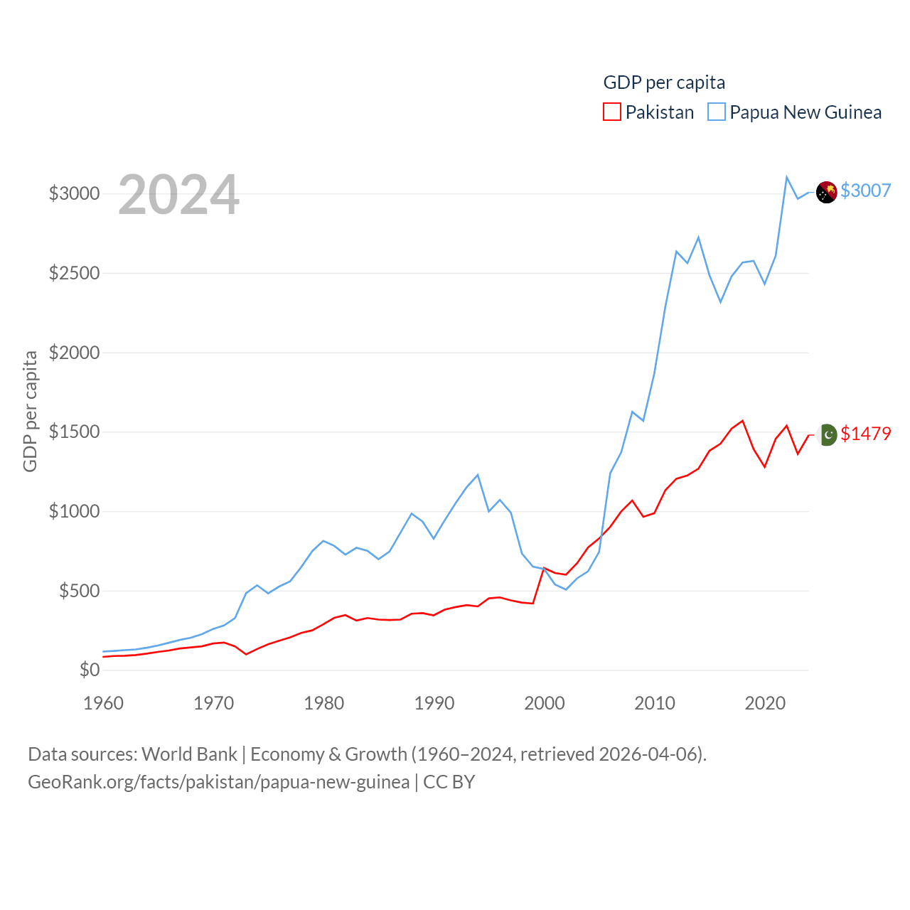 By GDP, Pakistan ranks 43/197 ($372B) and Papua New Guinea ranks 110/197 ($31.8B). By GDP per capita, Pakistan ranks 163/197 ($1,479), while Papua New Guinea ranks 140/197 ($3,007).