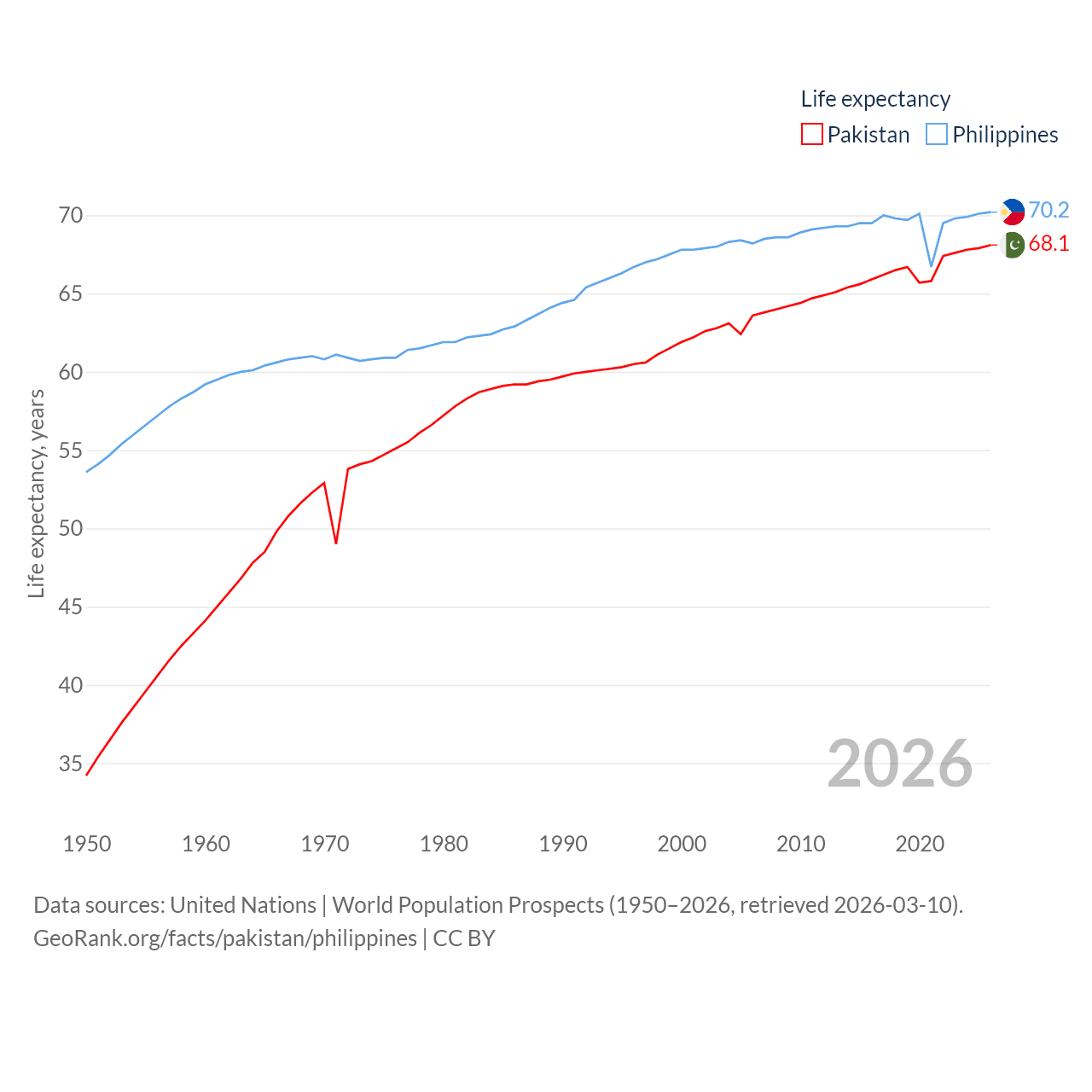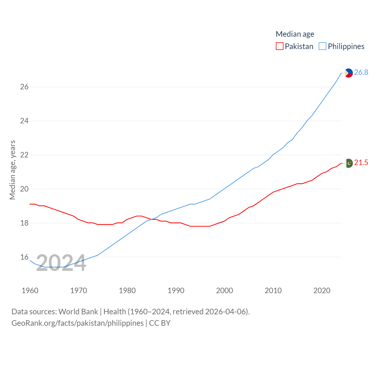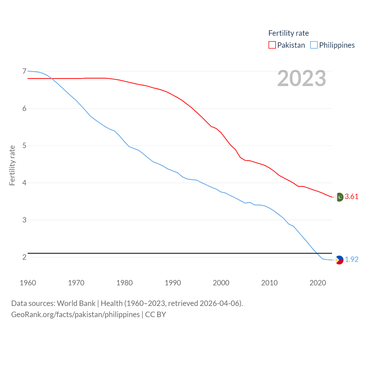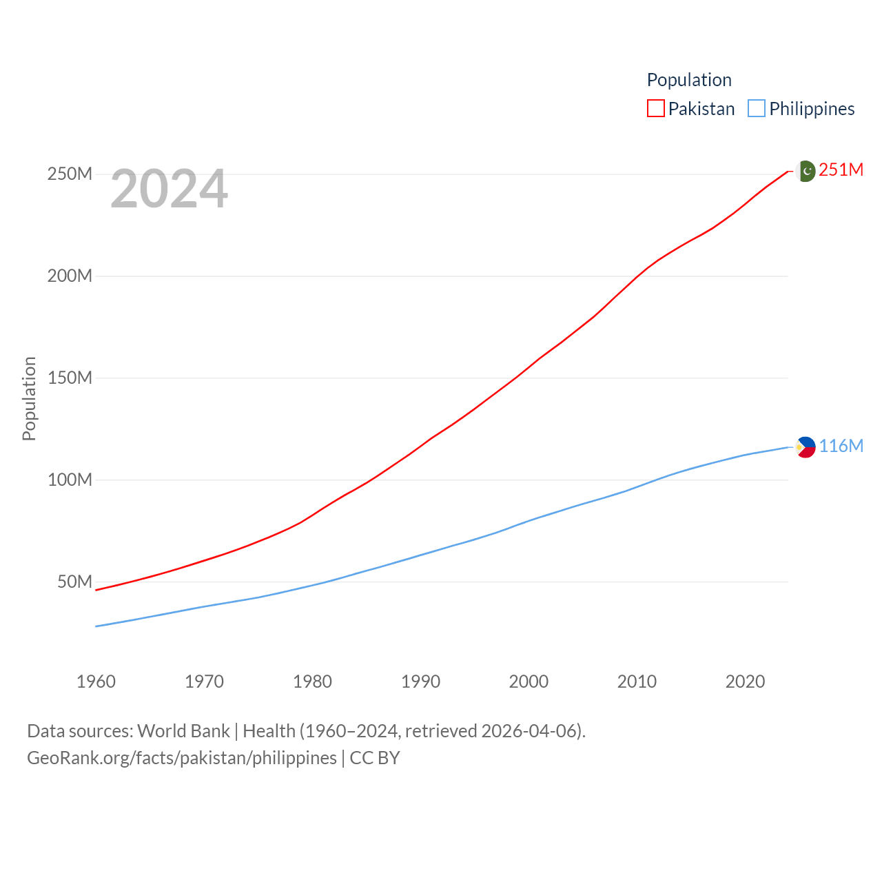 Pakistan has a population of 251M (ranked 5/197), compared with 116M in The Philippines (ranked 14/197). Pakistan's land area is 297,638 sq mi versus 115,124 sq mi for The Philippines (ranked 35th vs. 71st).