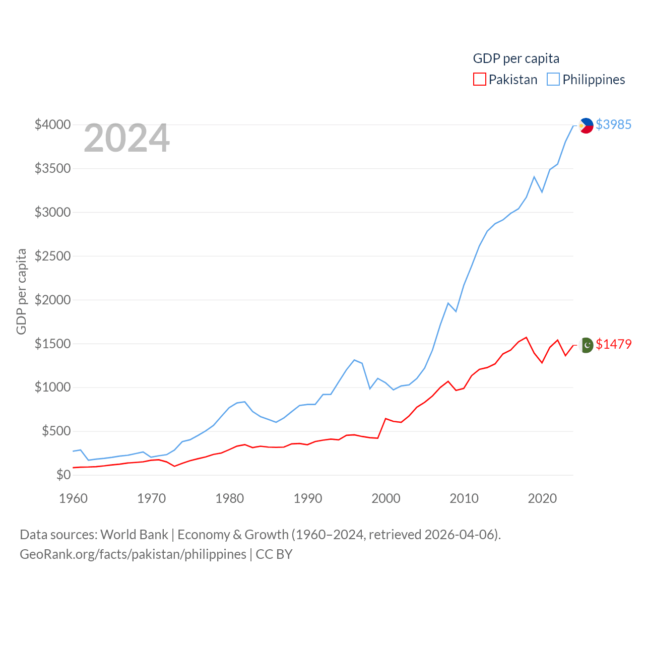 By GDP, Pakistan ranks 43/197 ($372B) and The Philippines ranks 35/197 ($462B). By GDP per capita, Pakistan ranks 163/197 ($1,479), while The Philippines ranks 130/197 ($3,985).