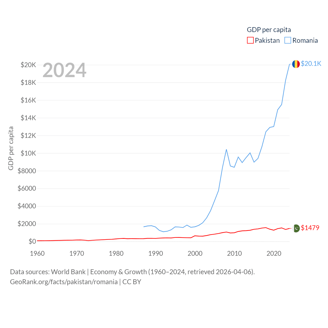 By GDP, Pakistan ranks 43/197 ($372B) and Romania ranks 42/197 ($383B). By GDP per capita, Pakistan ranks 163/197 ($1,479), while Romania ranks 58/197 ($20,080).