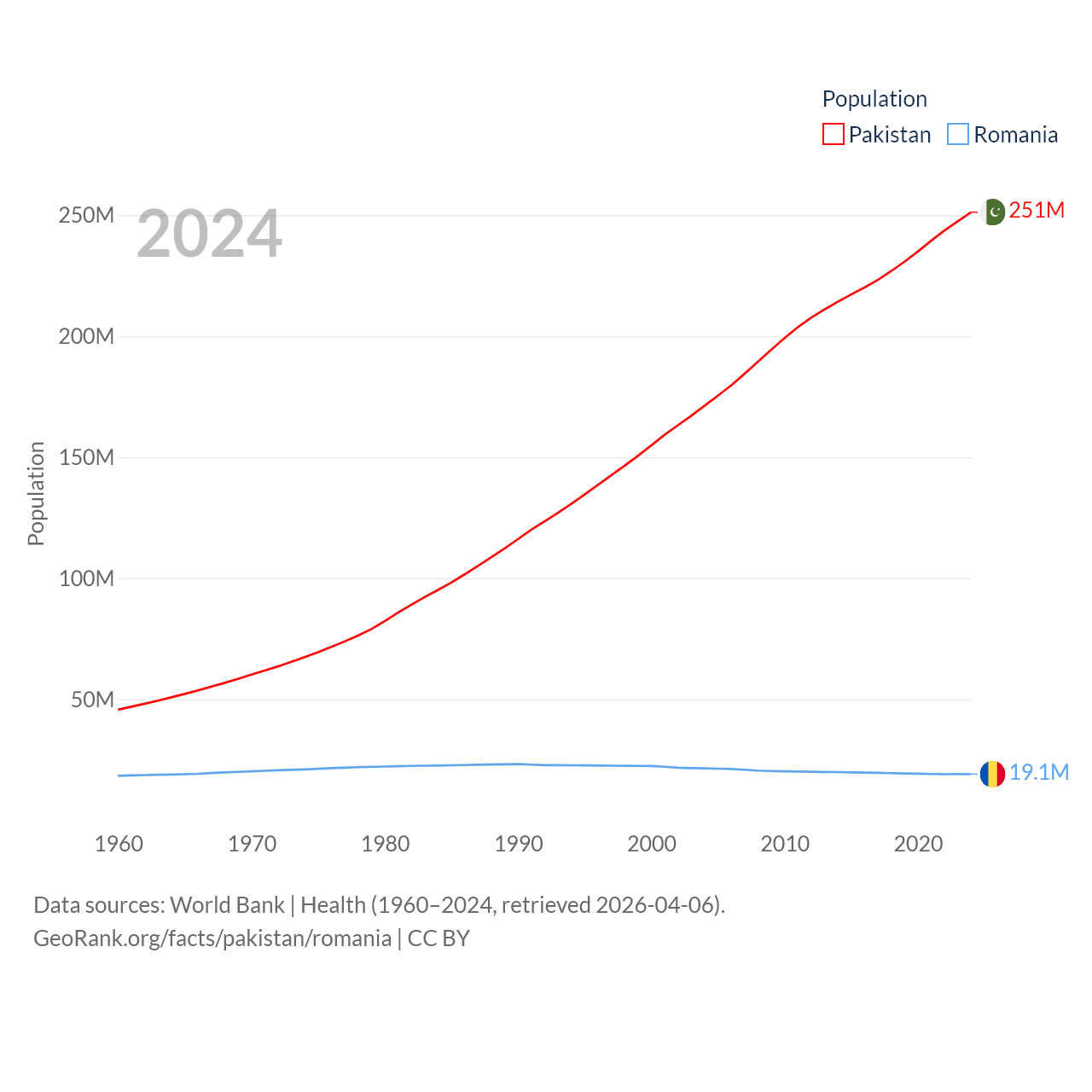Pakistan has a population of 251M (ranked 5/197), compared with 19.1M in Romania (ranked 67/197). Pakistan's land area is 297,638 sq mi versus 88,834 sq mi for Romania (ranked 35th vs. 80th).