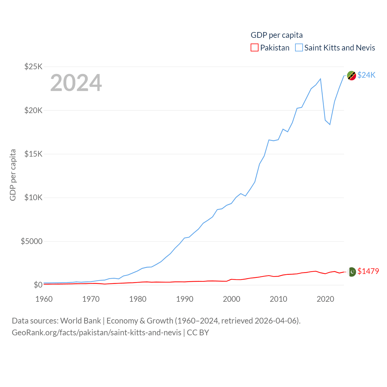 By GDP, Pakistan ranks 43/197 ($372B) and Saint Kitts and Nevis ranks 187/197 ($1.12B). By GDP per capita, Pakistan ranks 163/197 ($1,479), while Saint Kitts and Nevis ranks 51/197 ($23,961).