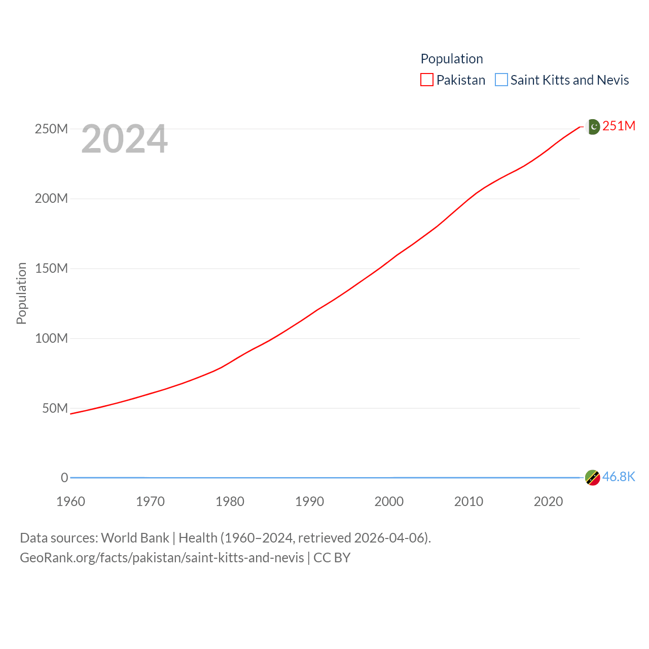 Pakistan has a population of 251M (ranked 5/197), compared with 46.8K in Saint Kitts and Nevis (ranked 189/197). Pakistan's land area is 297,638 sq mi versus 100.4 sq mi for Saint Kitts and Nevis (ranked 35th vs. 189th).