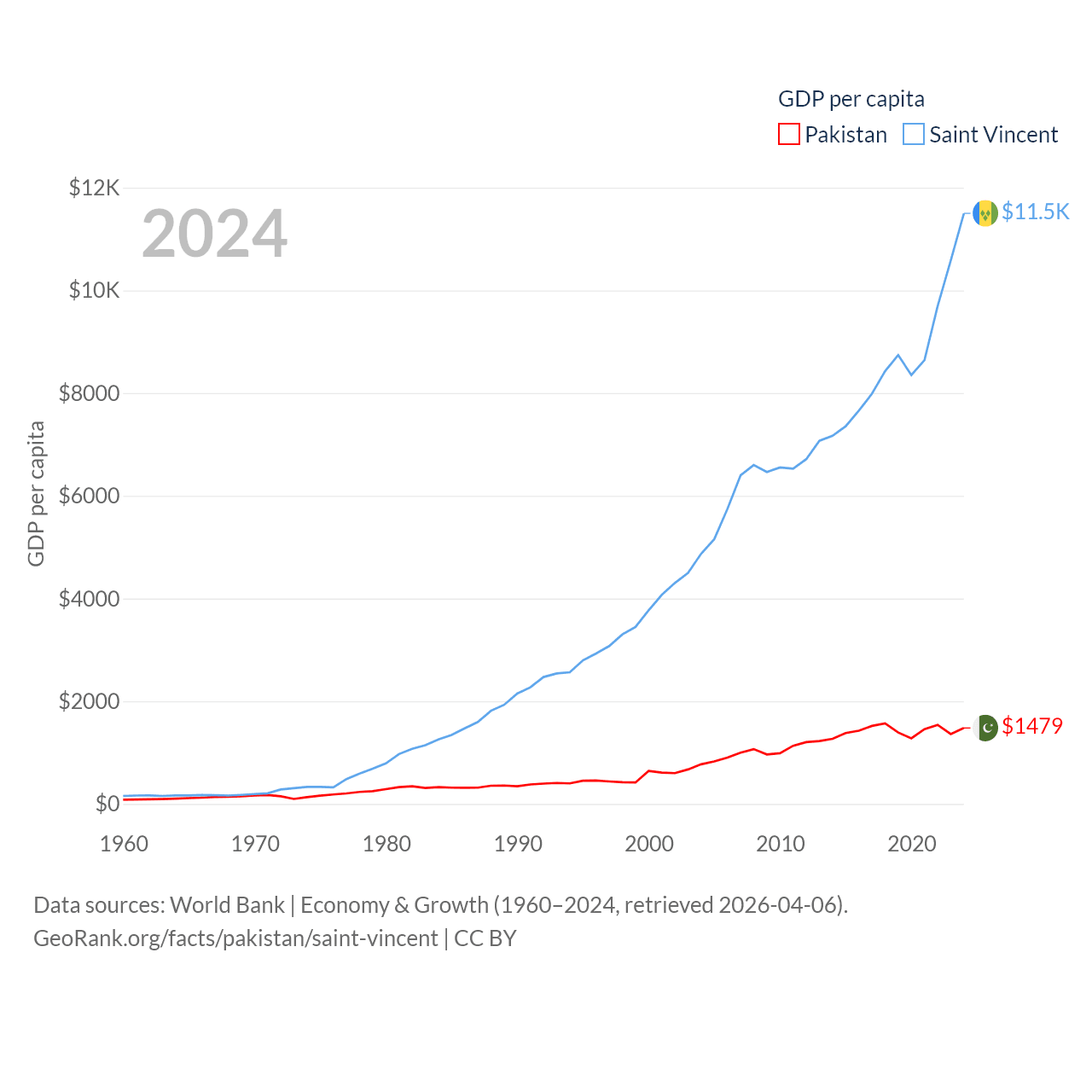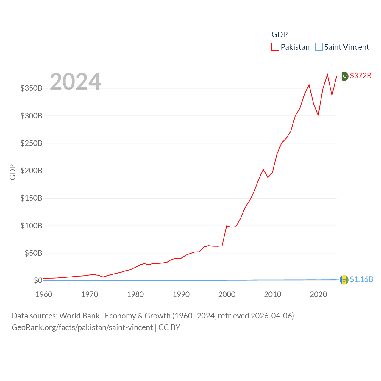 By GDP, Pakistan ranks 43/197 ($372B) and Saint Vincent ranks 186/197 ($1.16B). By GDP per capita, Pakistan ranks 163/197 ($1,479), while Saint Vincent ranks 81/197 ($11,501).