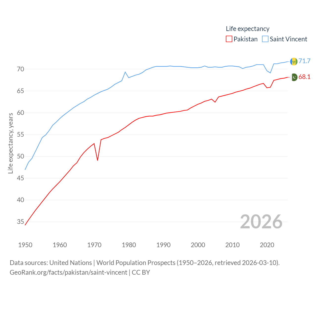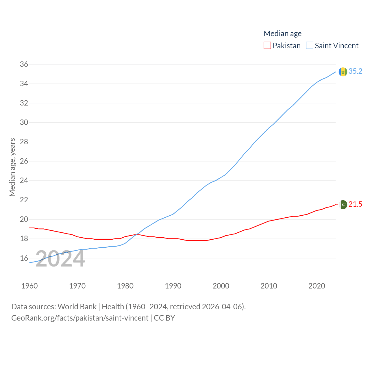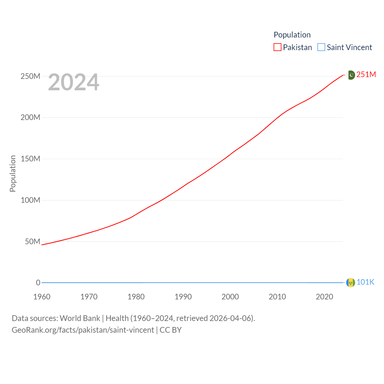 Pakistan has a population of 251M (ranked 5/197), compared with 101K in Saint Vincent (ranked 184/197). Pakistan's land area is 297,638 sq mi versus 150.6 sq mi for Saint Vincent (ranked 35th vs. 185th).