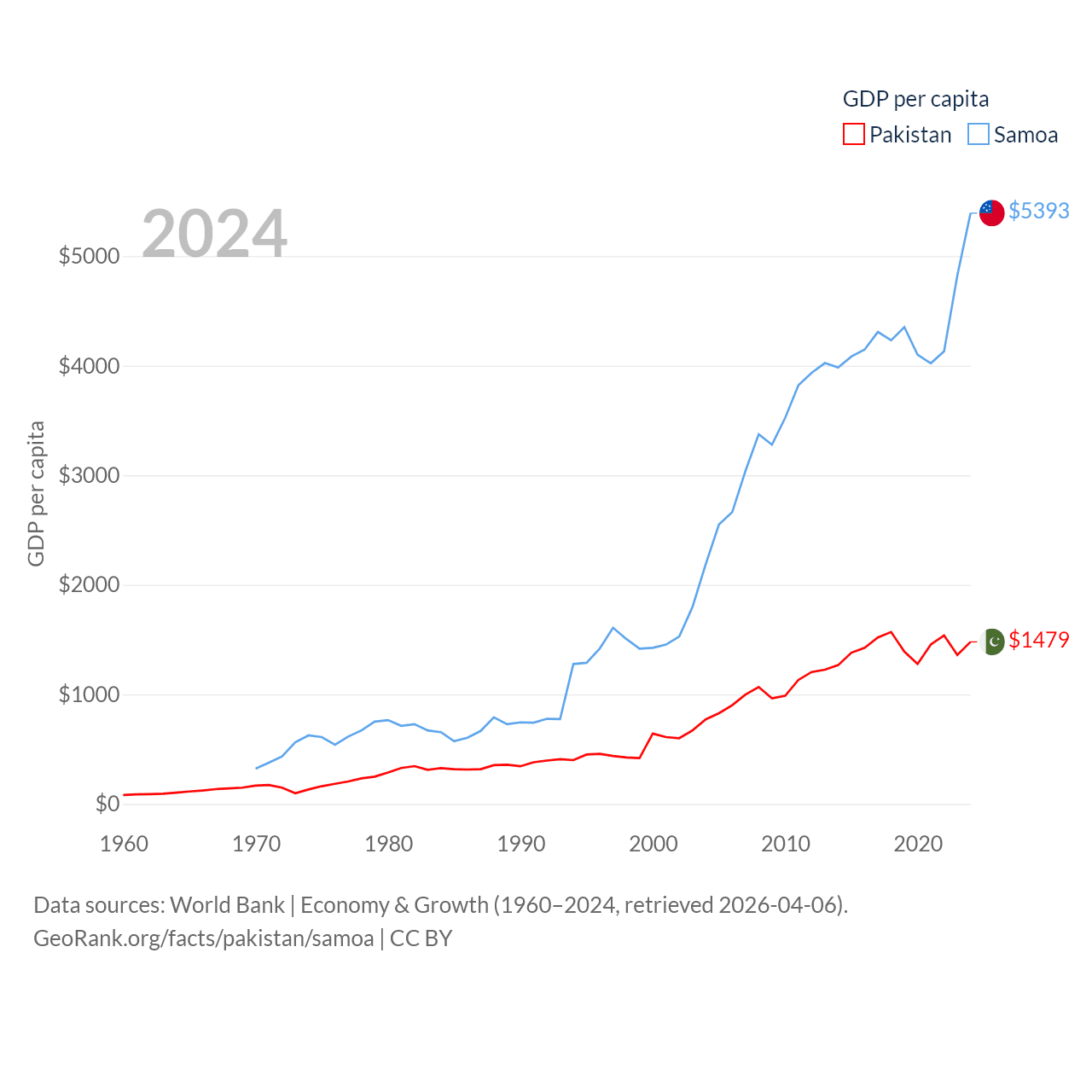 By GDP, Pakistan ranks 43/197 ($372B) and Samoa ranks 185/197 ($1.18B). By GDP per capita, Pakistan ranks 163/197 ($1,479), while Samoa ranks 117/197 ($5,393).