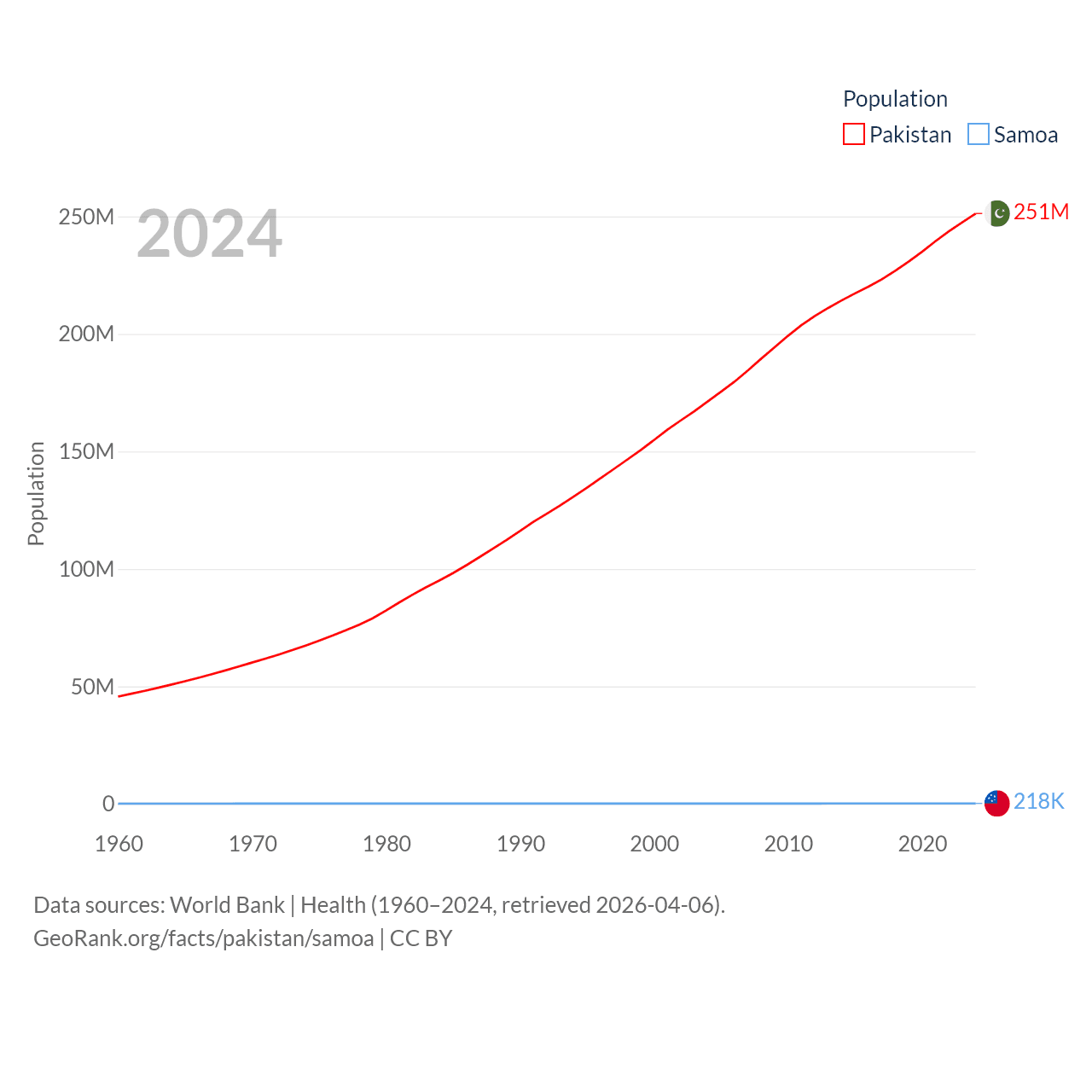 Pakistan has a population of 251M (ranked 5/197), compared with 218K in Samoa (ranked 177/197). Pakistan's land area is 297,638 sq mi versus 1,073 sq mi for Samoa (ranked 35th vs. 168th).