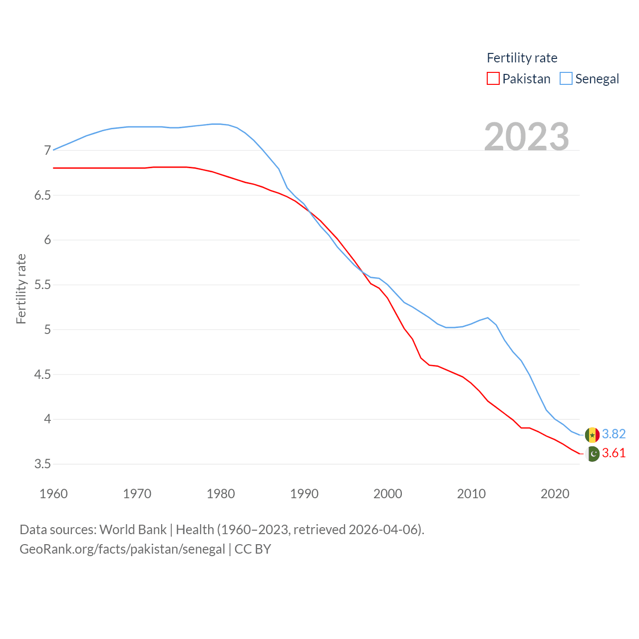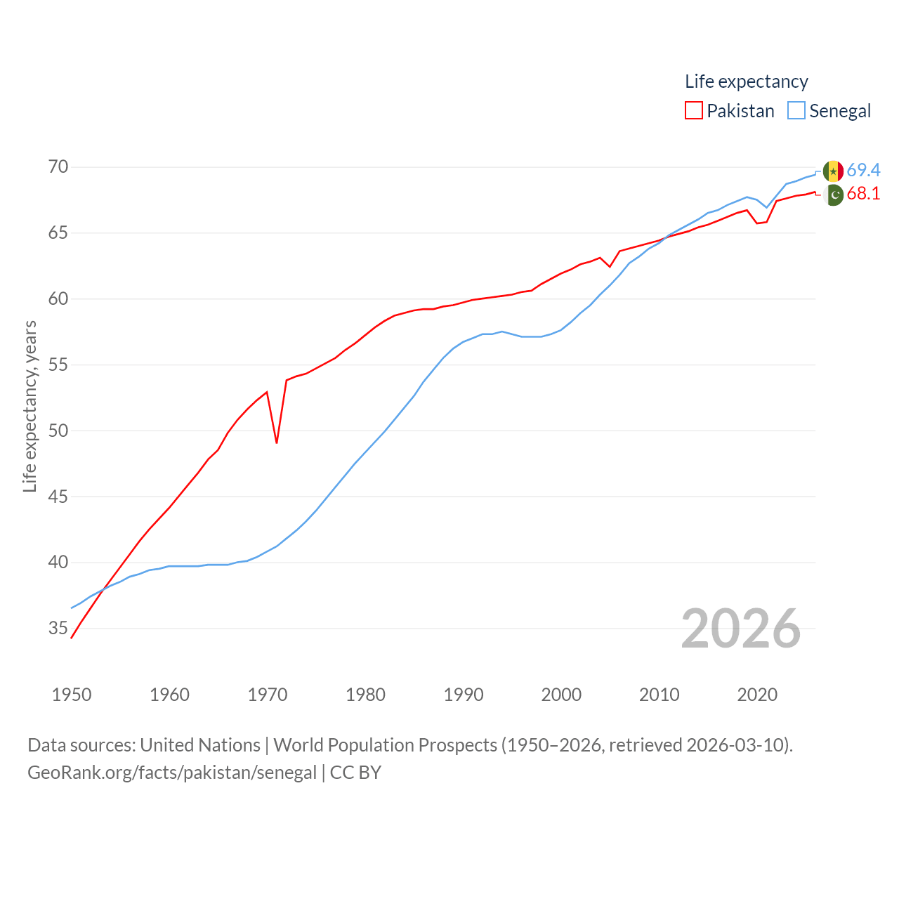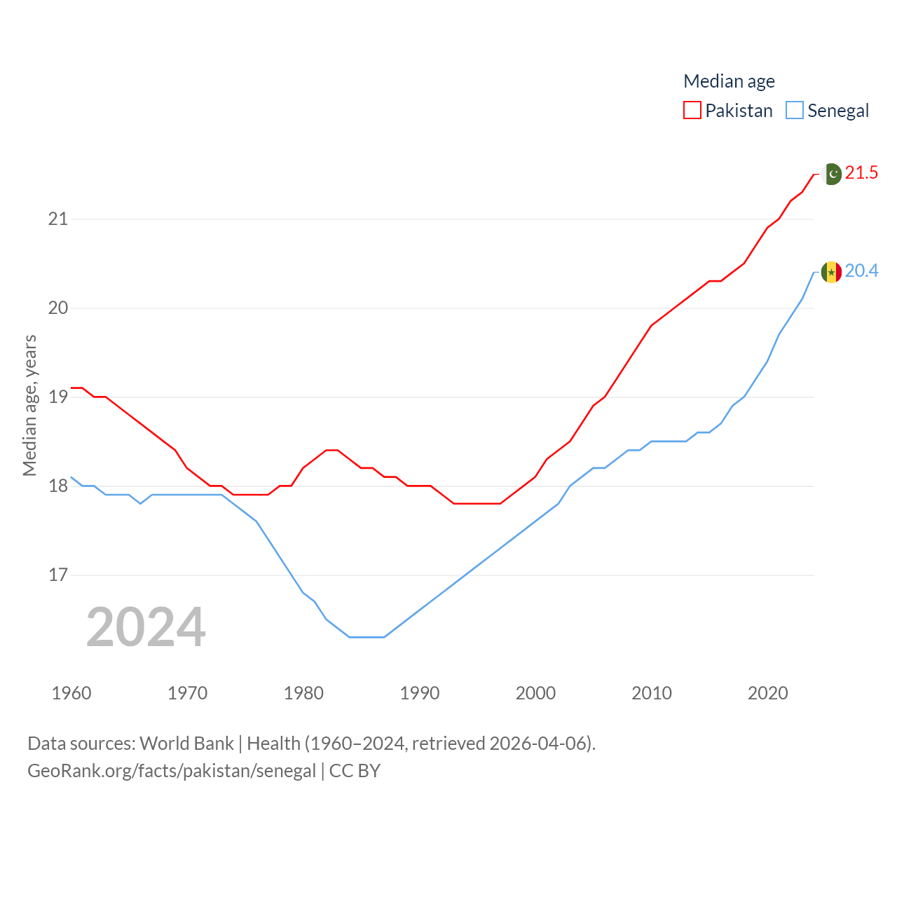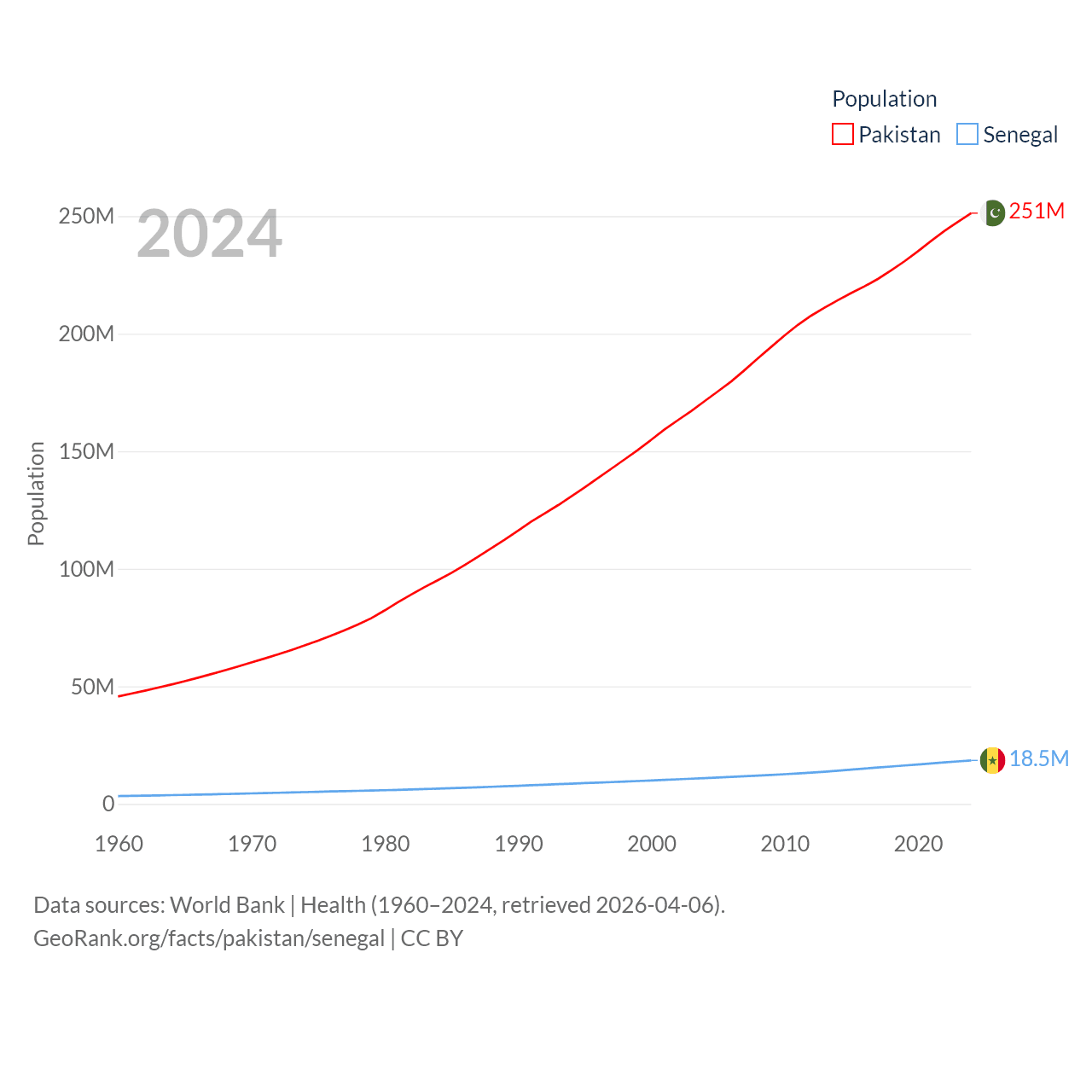 Pakistan has a population of 251M (ranked 5/197), compared with 18.5M in Senegal (ranked 69/197). Pakistan's land area is 297,638 sq mi versus 74,336 sq mi for Senegal (ranked 35th vs. 85th).