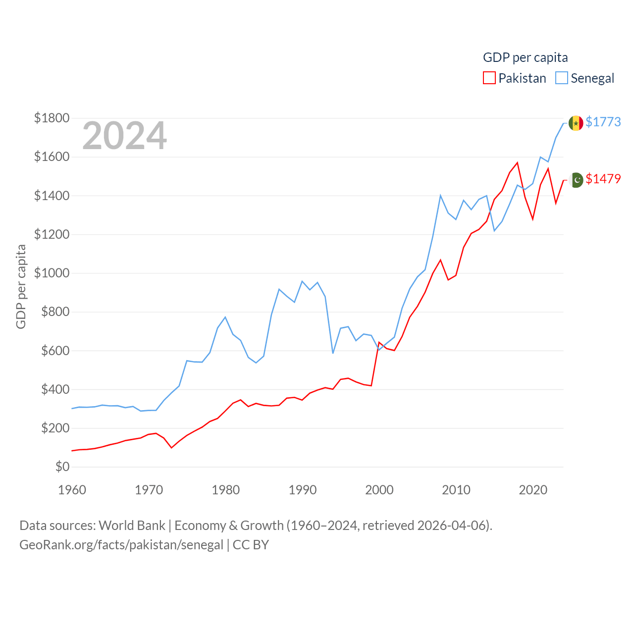 By GDP, Pakistan ranks 43/197 ($372B) and Senegal ranks 109/197 ($32.8B). By GDP per capita, Pakistan ranks 163/197 ($1,479), while Senegal ranks 159/197 ($1,773).