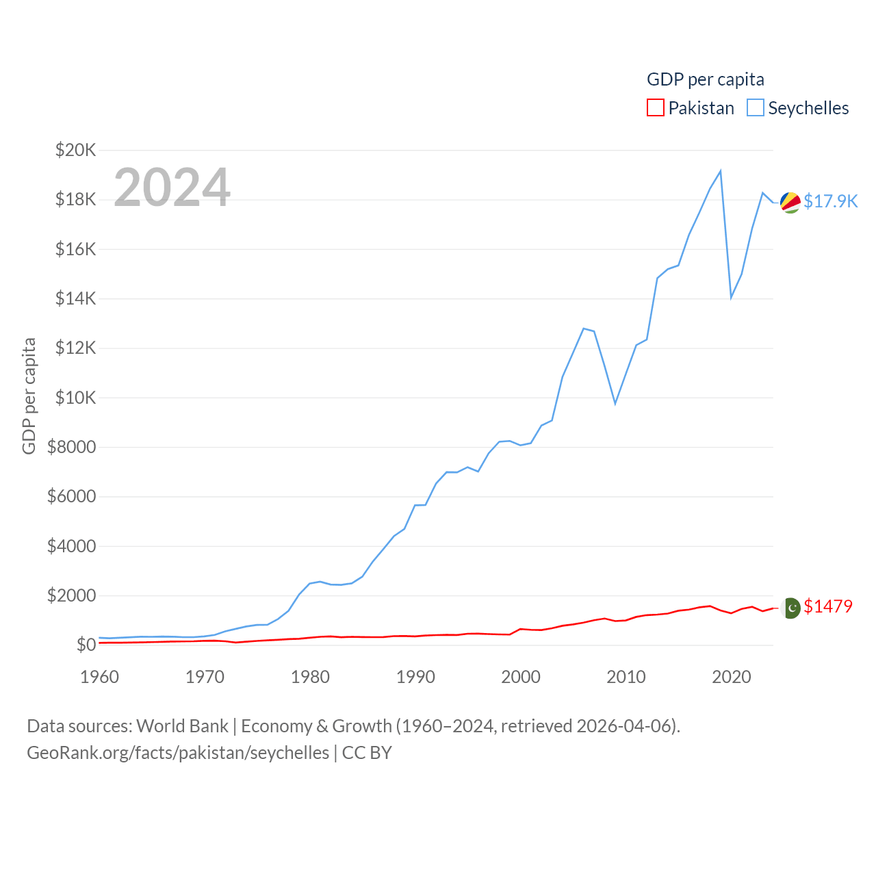 By GDP, Pakistan ranks 43/197 ($372B) and The Seychelles ranks 178/197 ($2.17B). By GDP per capita, Pakistan ranks 163/197 ($1,479), while The Seychelles ranks 63/197 ($17,859).