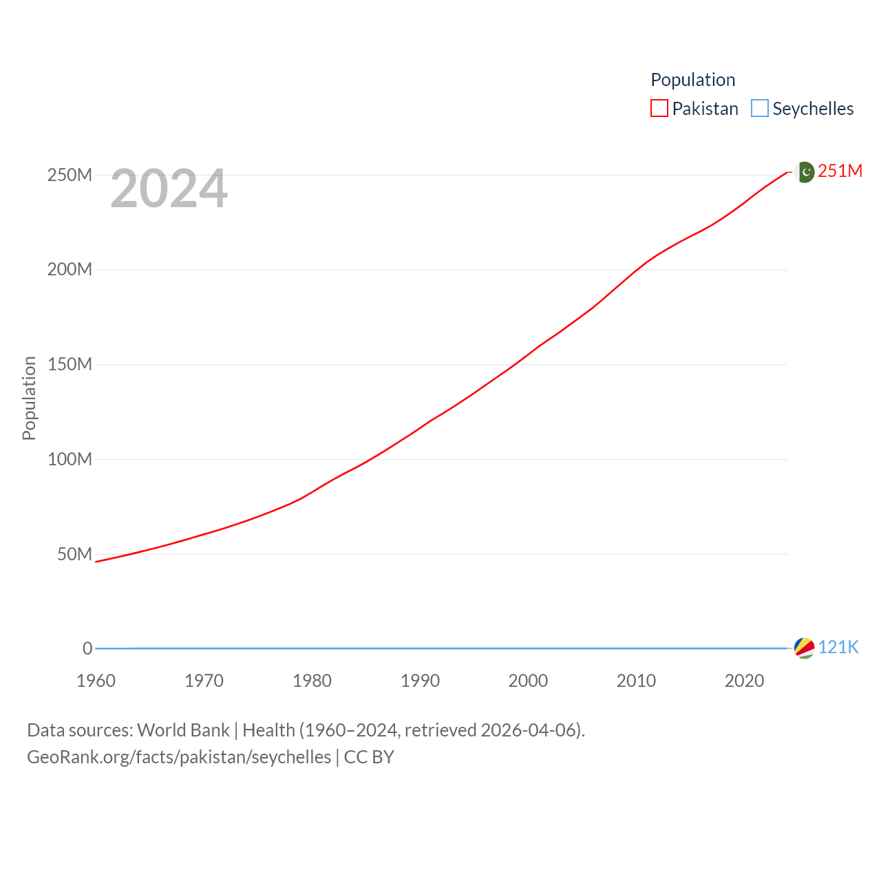 Pakistan has a population of 251M (ranked 5/197), compared with 121K in The Seychelles (ranked 181/197). Pakistan's land area is 297,638 sq mi versus 177.6 sq mi for The Seychelles (ranked 35th vs. 181st).