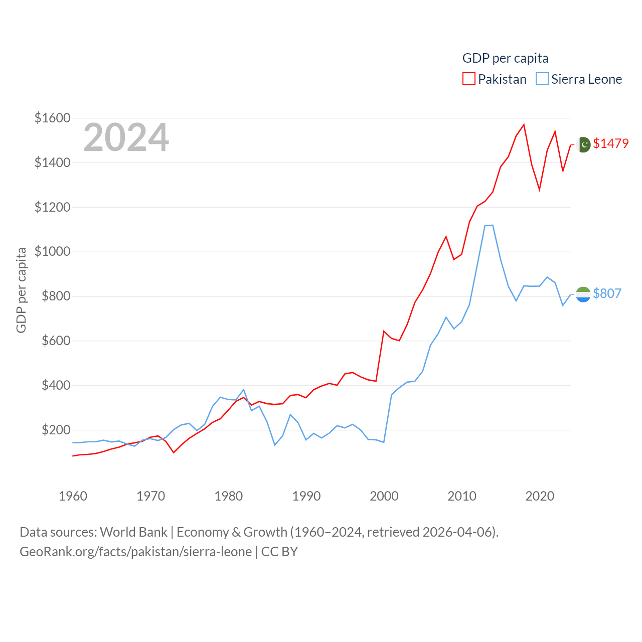 By GDP, Pakistan ranks 43/197 ($372B) and Sierra Leone ranks 160/197 ($6.97B). By GDP per capita, Pakistan ranks 163/197 ($1,479), while Sierra Leone ranks 186/197 ($807).