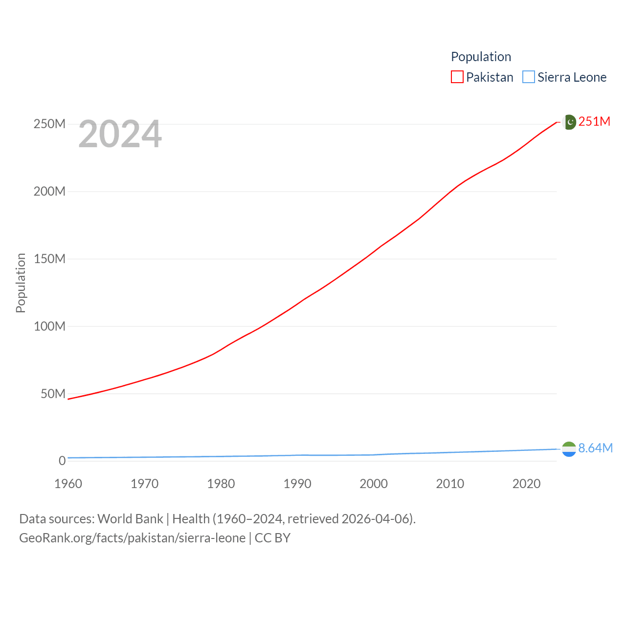 Pakistan has a population of 251M (ranked 5/197), compared with 8.64M in Sierra Leone (ranked 102/197). Pakistan's land area is 297,638 sq mi versus 27,869 sq mi for Sierra Leone (ranked 35th vs. 116th).