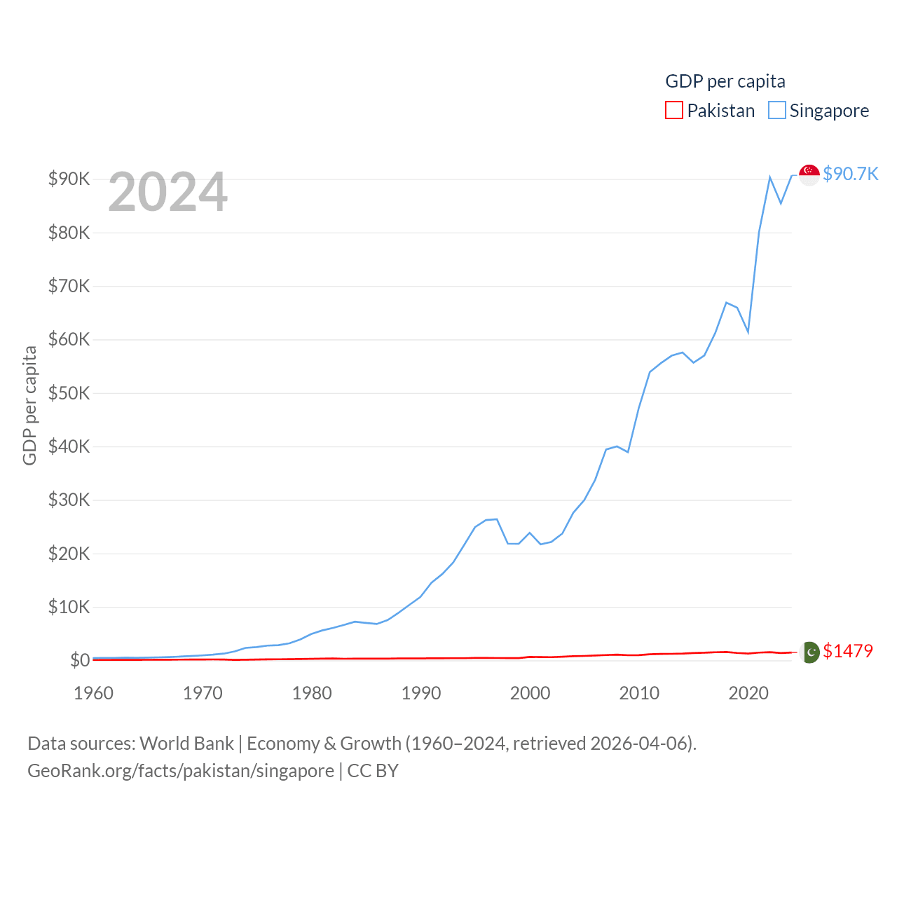 By GDP, Pakistan ranks 43/197 ($372B) and Singapore ranks 28/197 ($547B). By GDP per capita, Pakistan ranks 163/197 ($1,479), while Singapore ranks 7/197 ($90,674).