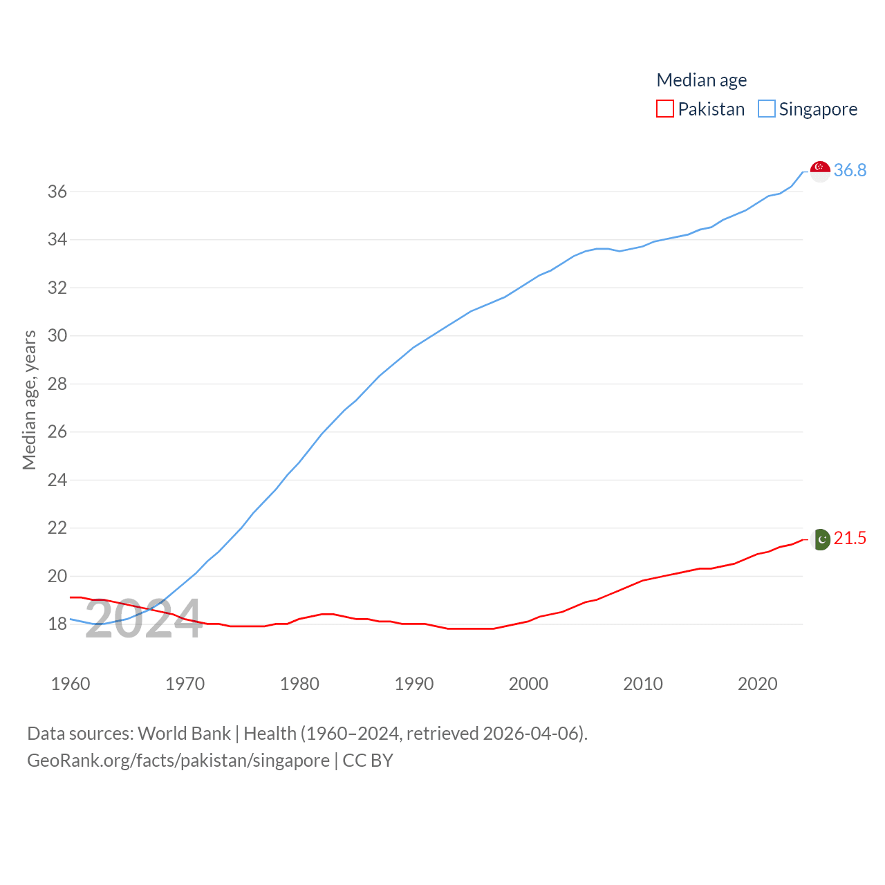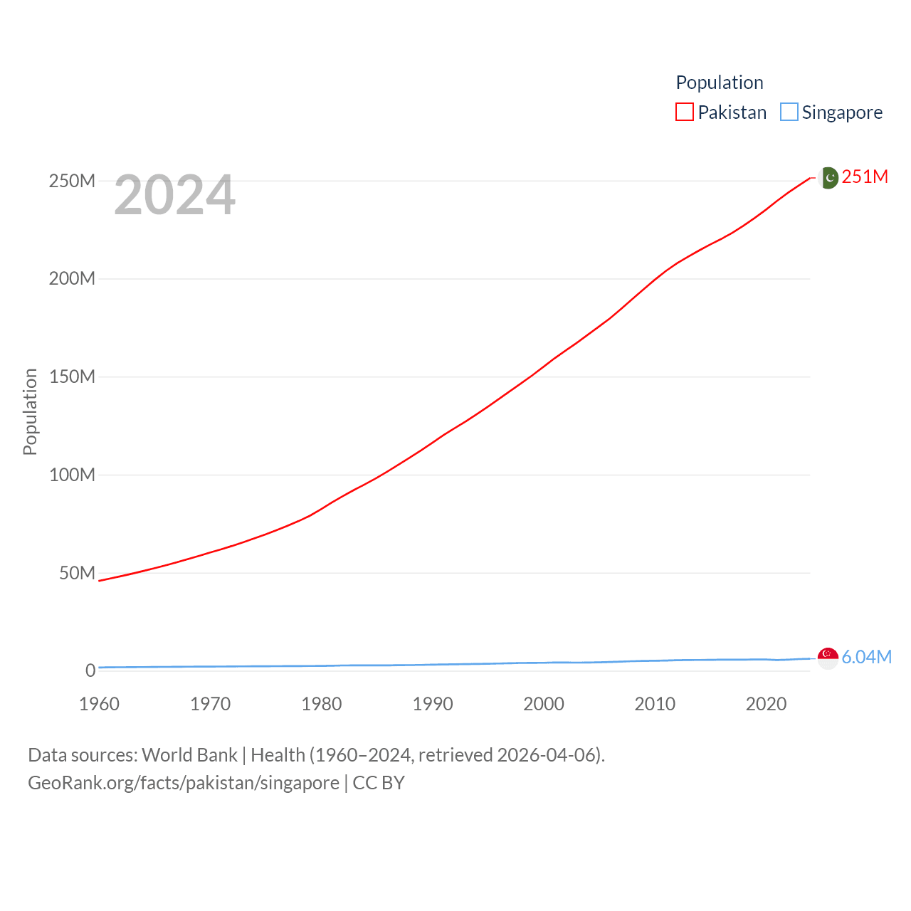 Pakistan has a population of 251M (ranked 5/197), compared with 6.04M in Singapore (ranked 113/197). Pakistan's land area is 297,638 sq mi versus 277.2 sq mi for Singapore (ranked 35th vs. 177th).