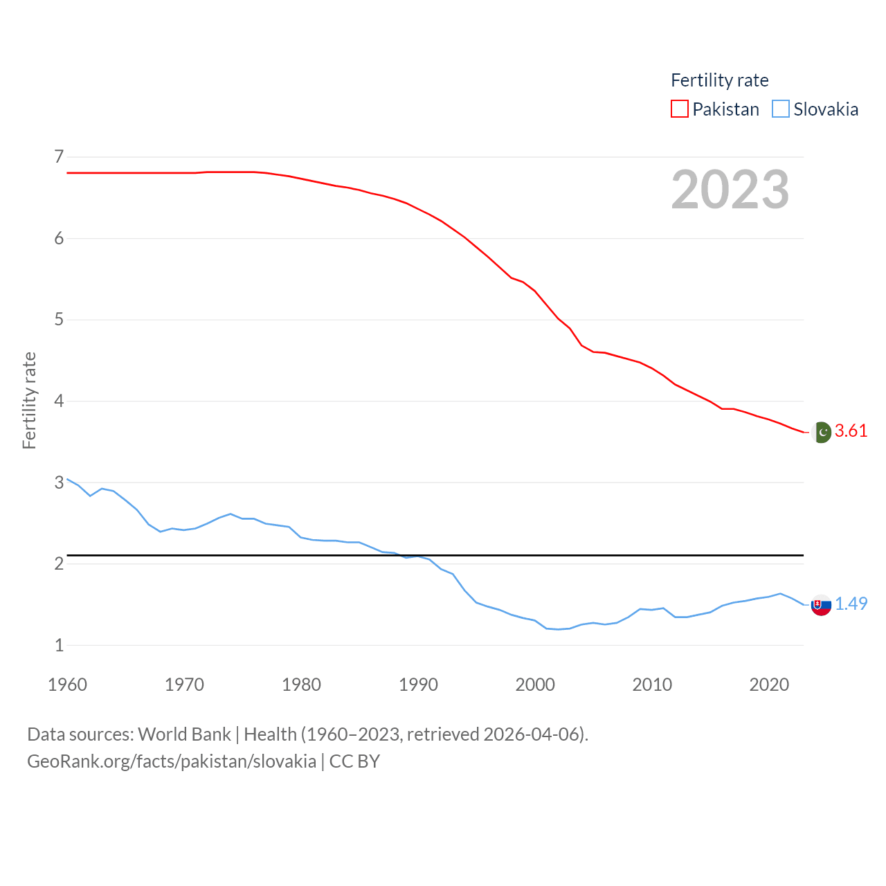 Pakistan has a population of 251M (ranked 5/197), compared with 5.42M in Slovakia (ranked 119/197). Pakistan's land area is 297,638 sq mi versus 18,564 sq mi for Slovakia (ranked 35th vs. 128th).