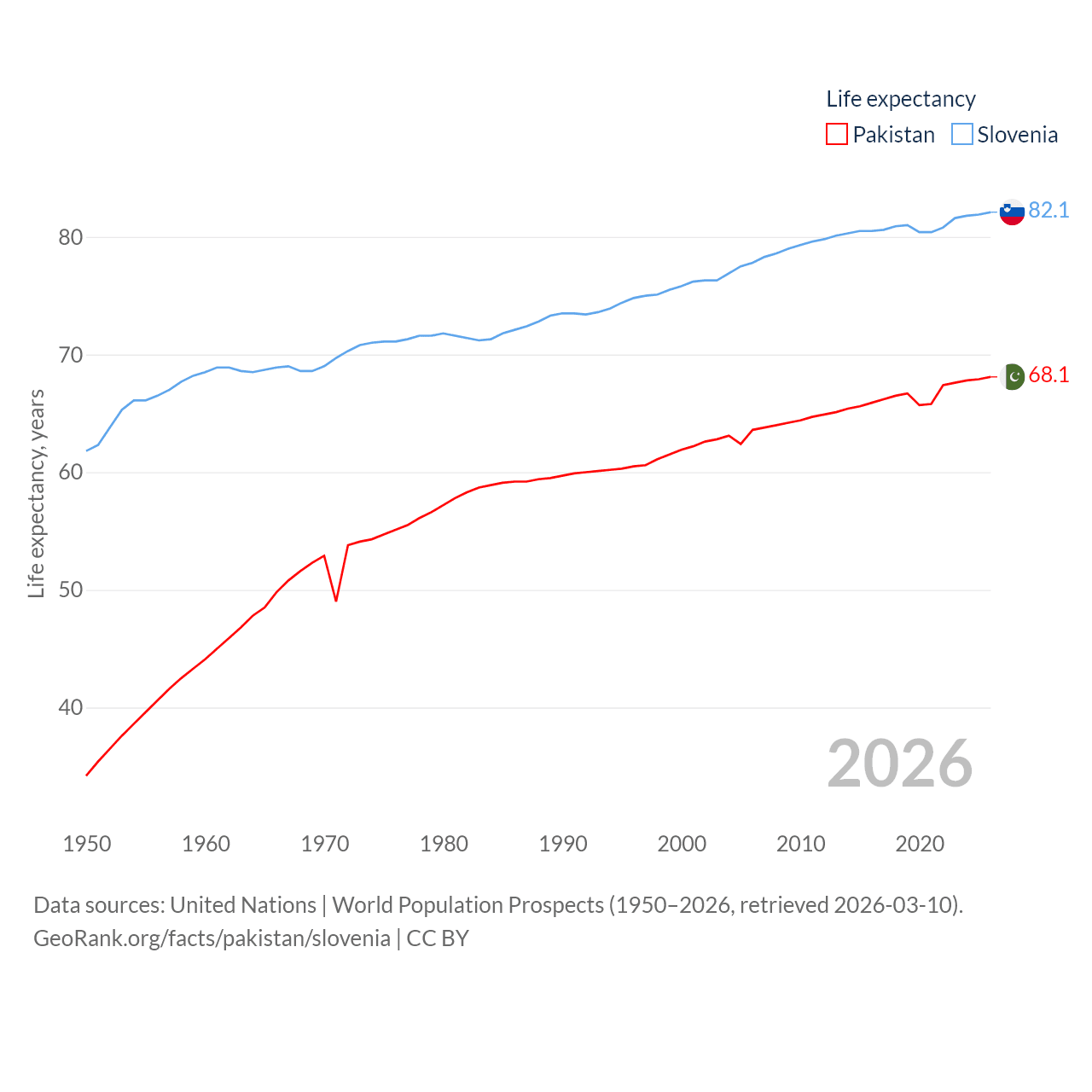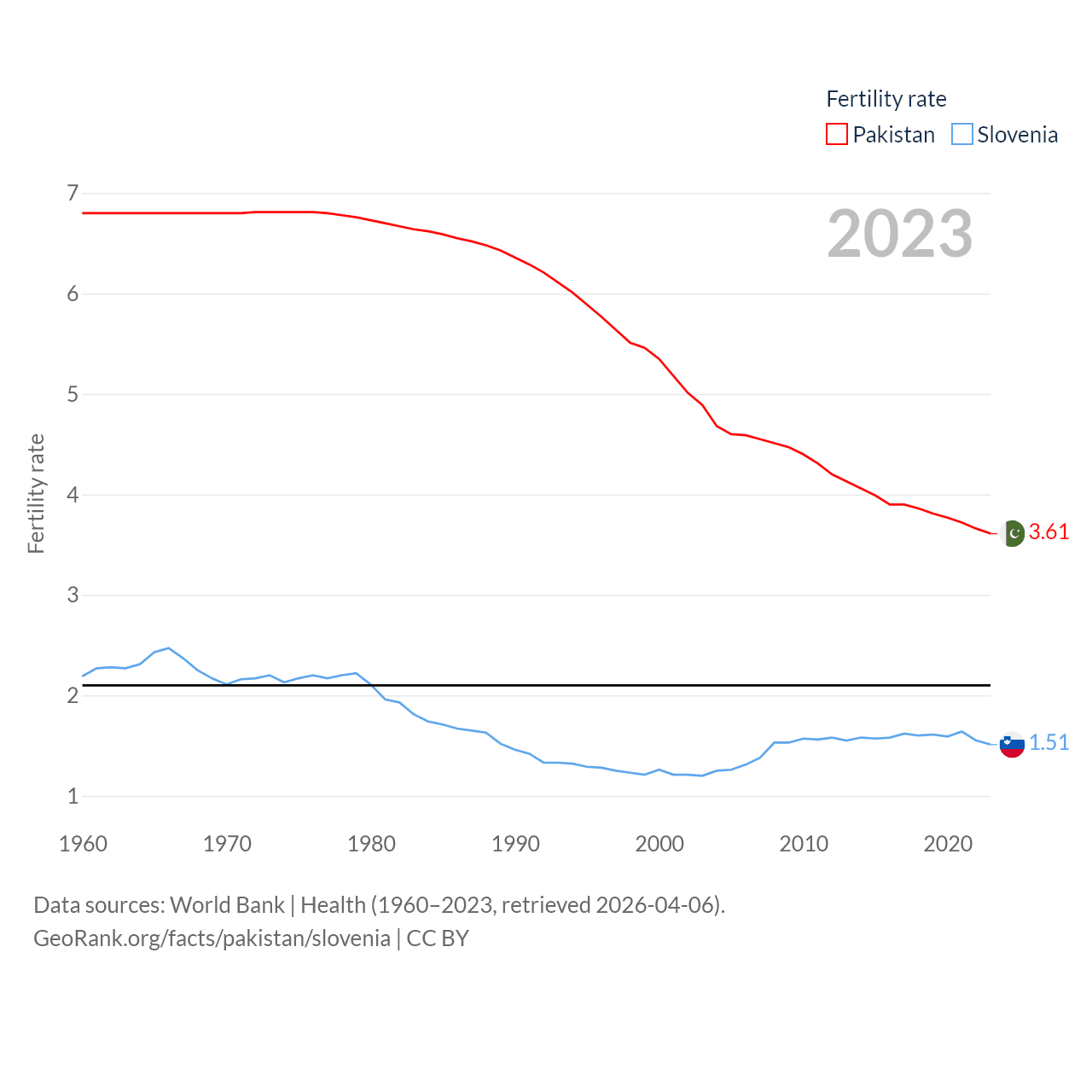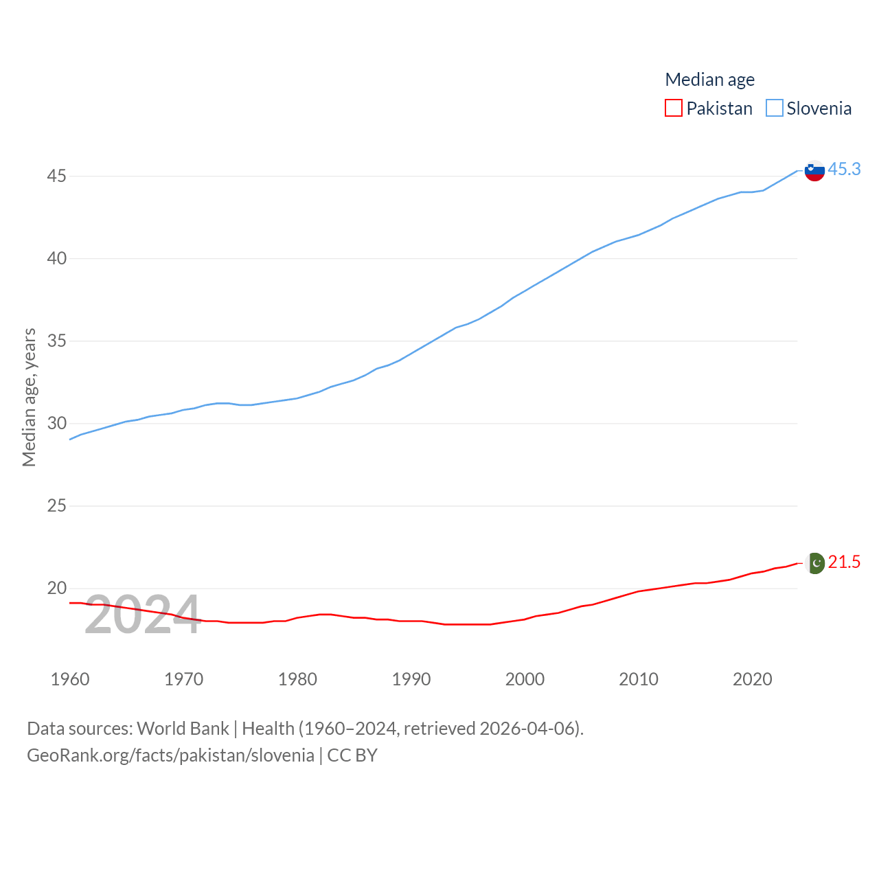 Pakistan has a population of 251M (ranked 5/197), compared with 2.13M in Slovenia (ranked 147/197). Pakistan's land area is 297,638 sq mi versus 7,774 sq mi for Slovenia (ranked 35th vs. 151st).