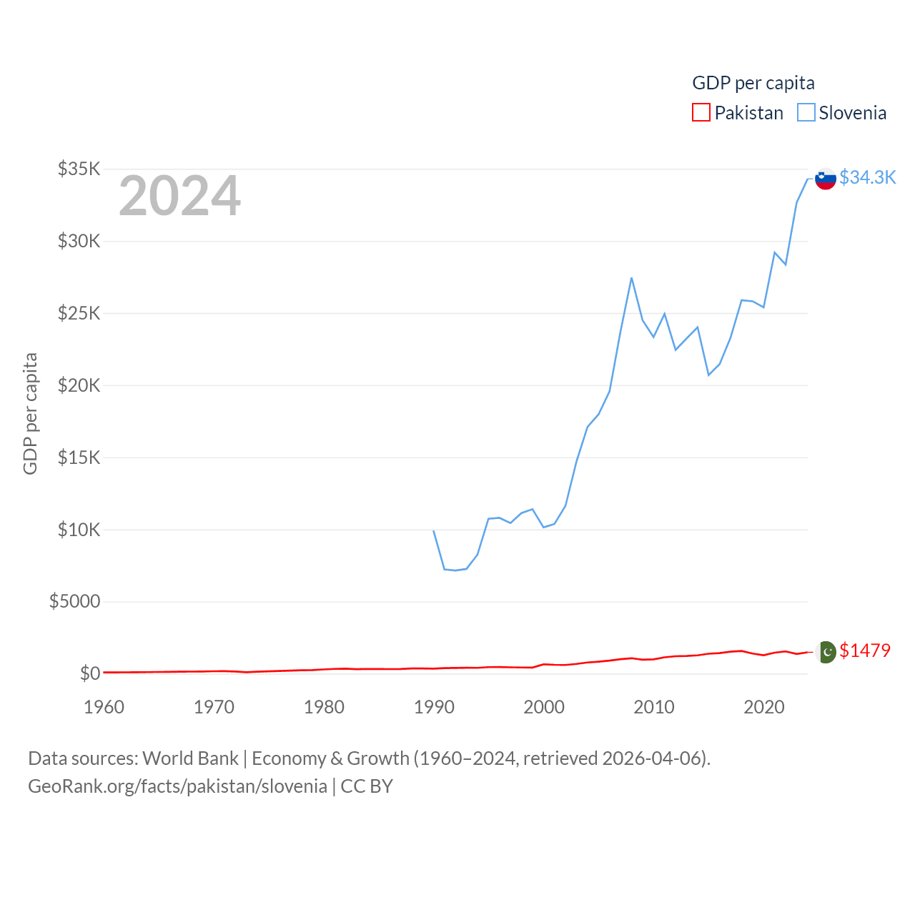 By GDP, Pakistan ranks 43/197 ($372B) and Slovenia ranks 86/197 ($73B). By GDP per capita, Pakistan ranks 163/197 ($1,479), while Slovenia ranks 34/197 ($34,301).