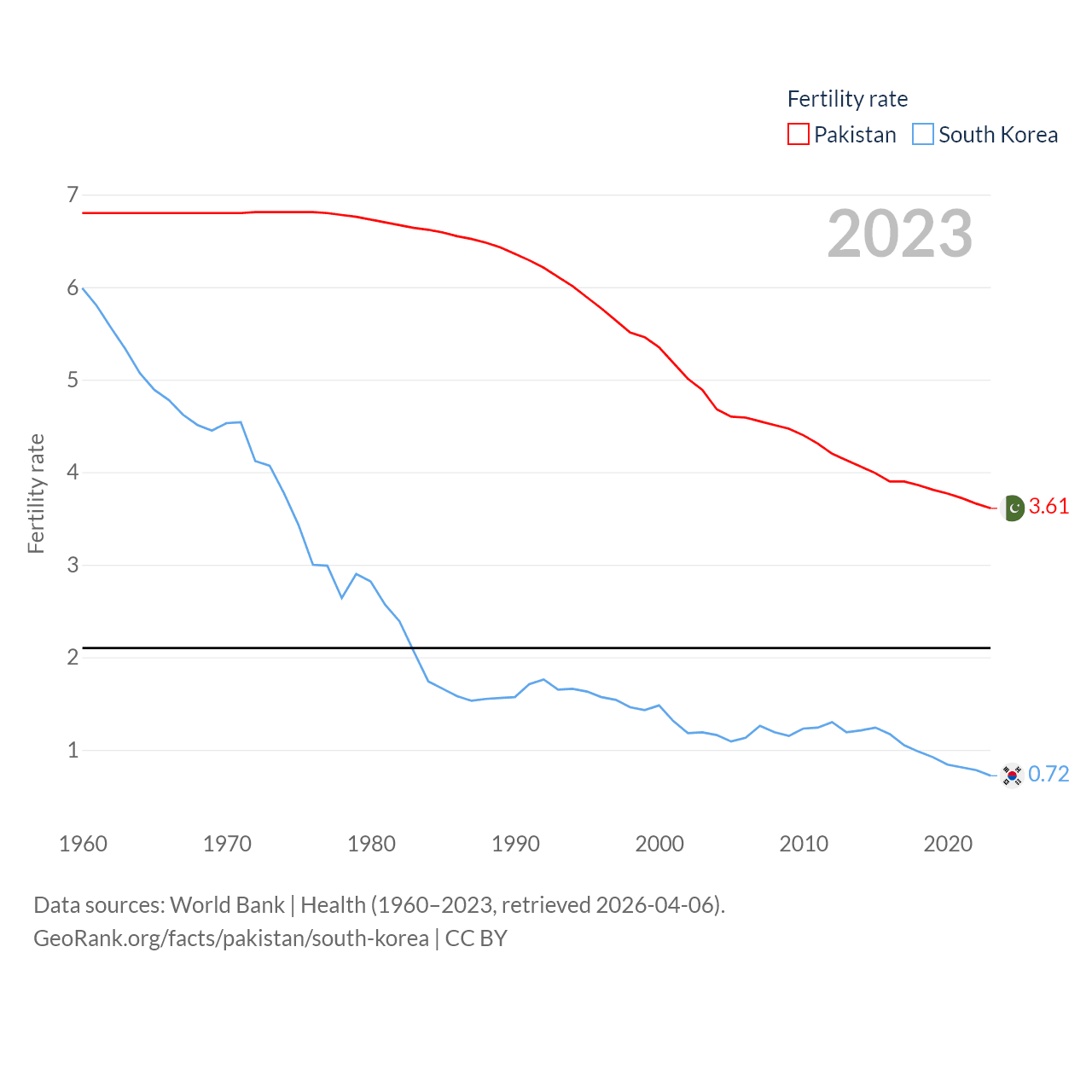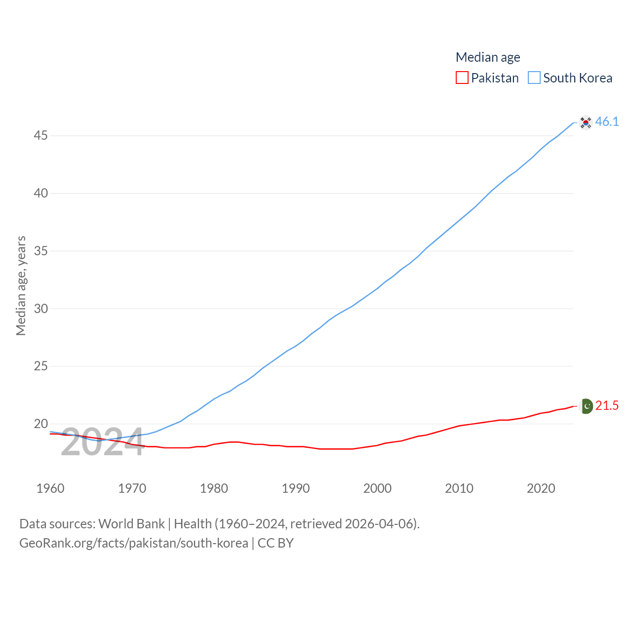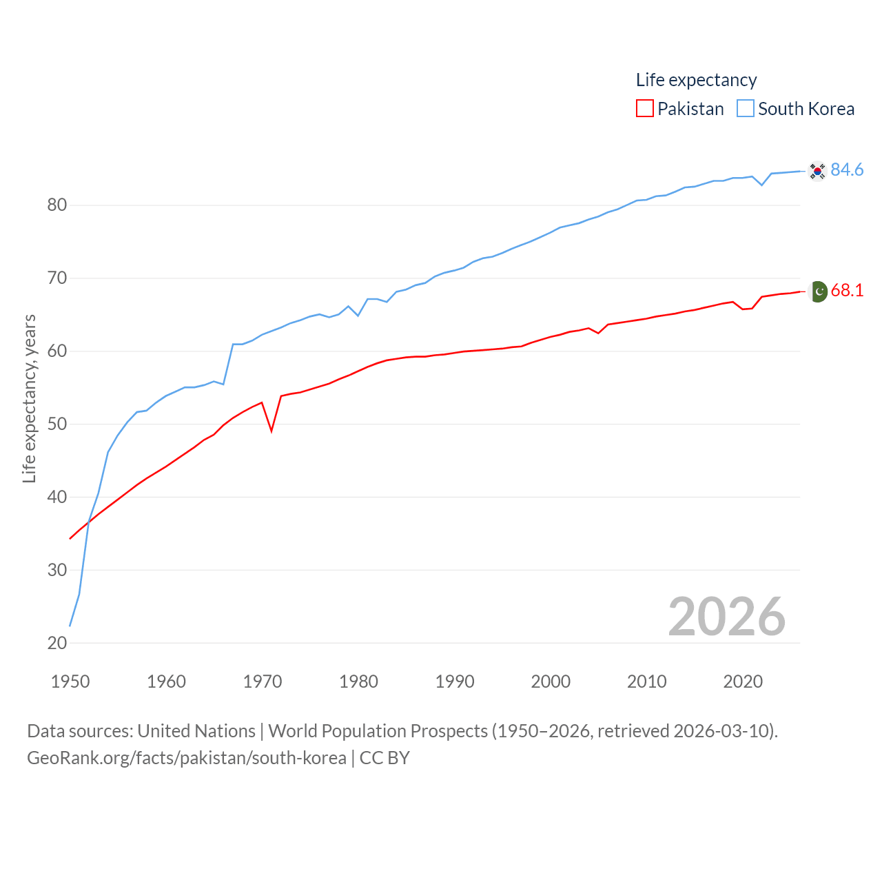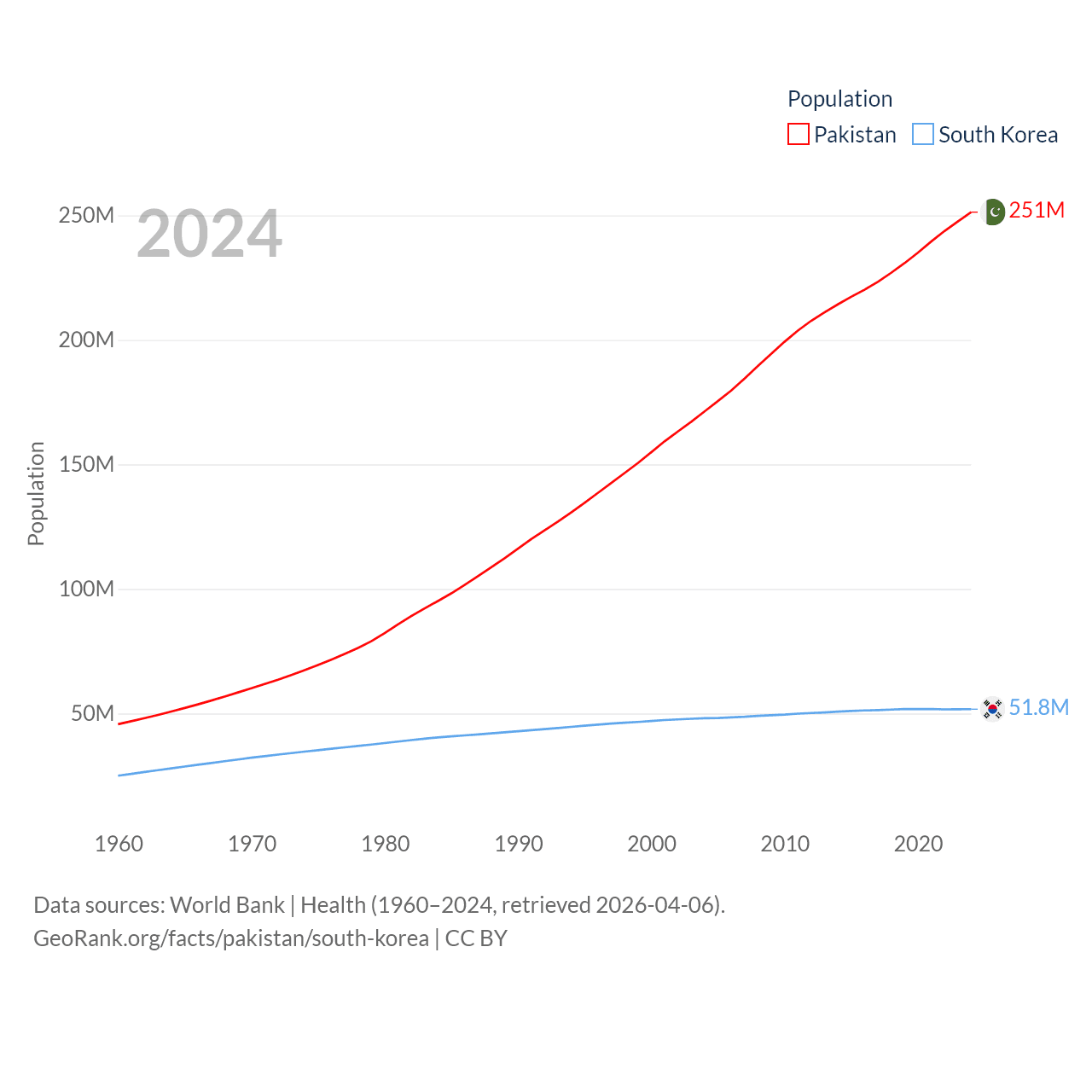Pakistan has a population of 251M (ranked 5/197), compared with 51.8M in South Korea (ranked 29/197). Pakistan's land area is 297,638 sq mi versus 37,684 sq mi for South Korea (ranked 35th vs. 105th).