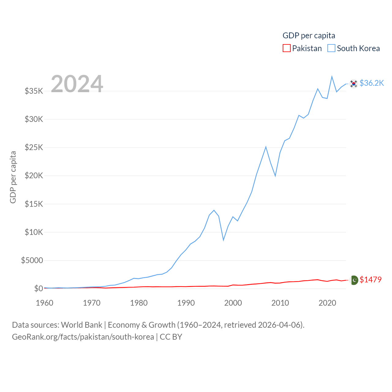 By GDP, Pakistan ranks 43/197 ($372B) and South Korea ranks 12/197 ($1.88T). By GDP per capita, Pakistan ranks 163/197 ($1,479), while South Korea ranks 31/197 ($36,239).