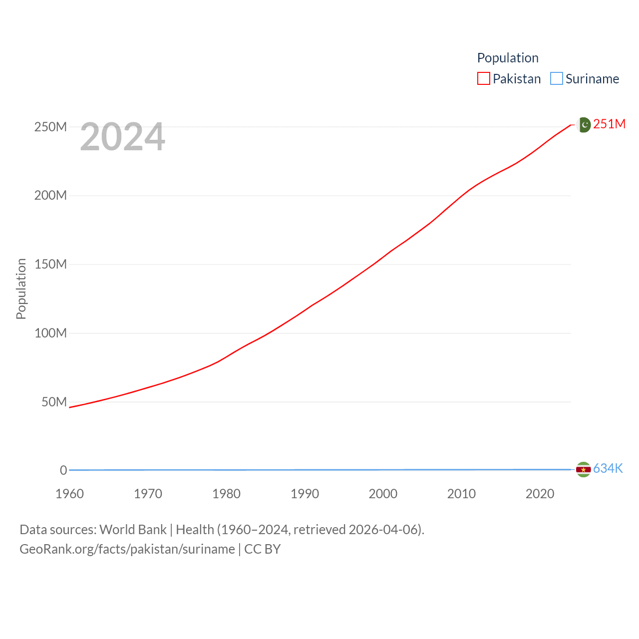Pakistan has a population of 251M (ranked 5/197), compared with 634K in Suriname (ranked 165/197). Pakistan's land area is 297,638 sq mi versus 61,972 sq mi for Suriname (ranked 35th vs. 90th).