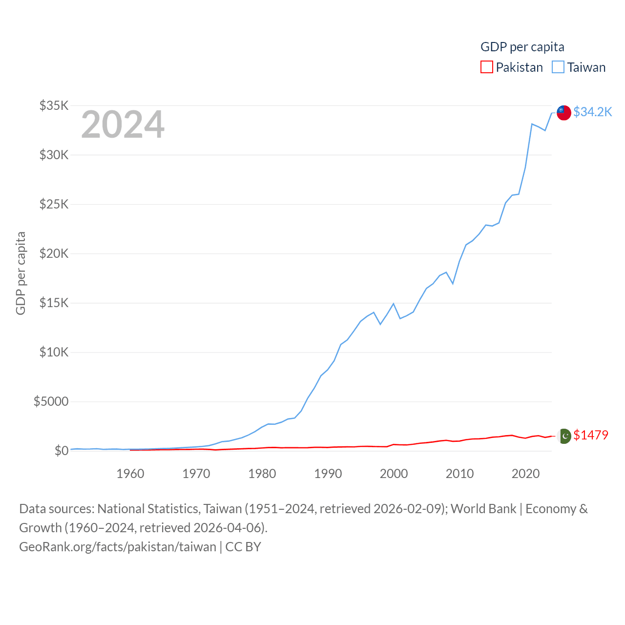By GDP, Pakistan ranks 43/197 ($372B) and Taiwan ranks 22/197 ($802B). By GDP per capita, Pakistan ranks 163/197 ($1,479), while Taiwan ranks 35/197 ($34,238).