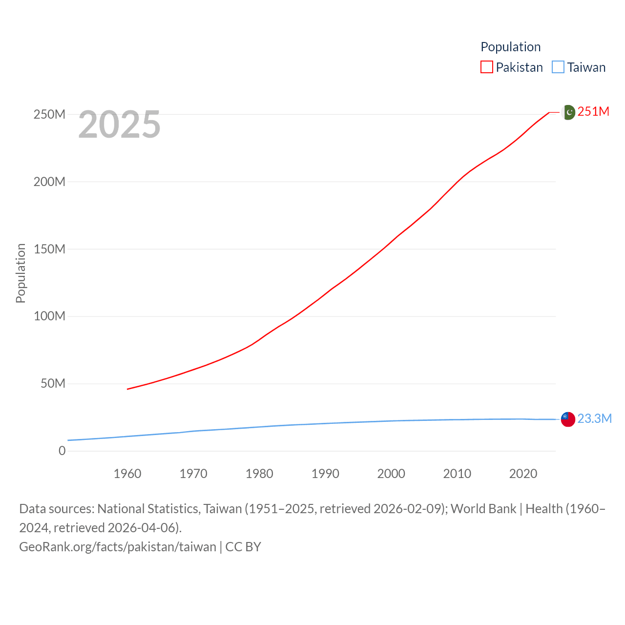 Pakistan has a population of 251M (ranked 5/197), compared with 23.3M in Taiwan (ranked 60/197). Pakistan's land area is 297,638 sq mi versus 13,976 sq mi for Taiwan (ranked 35th vs. 133rd).