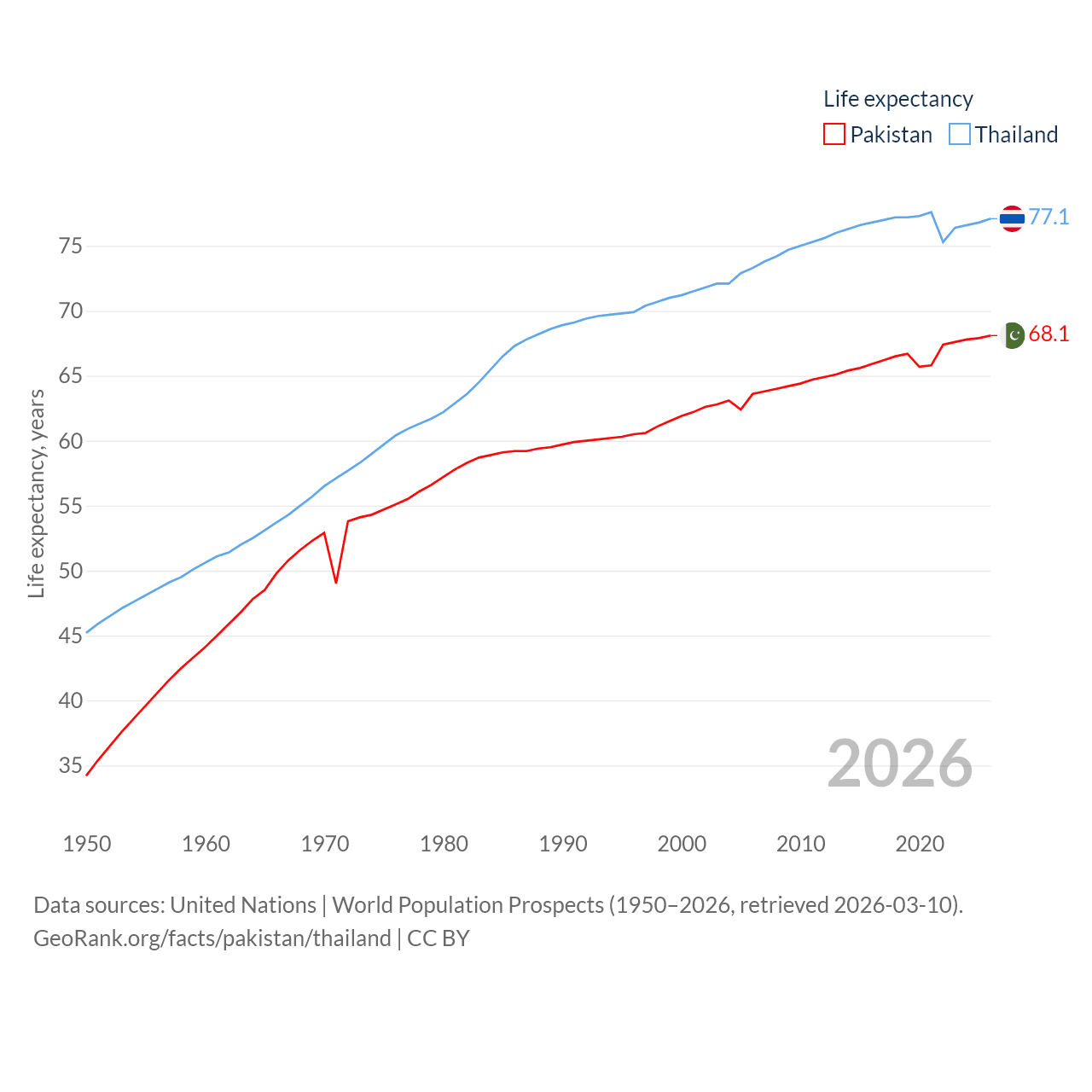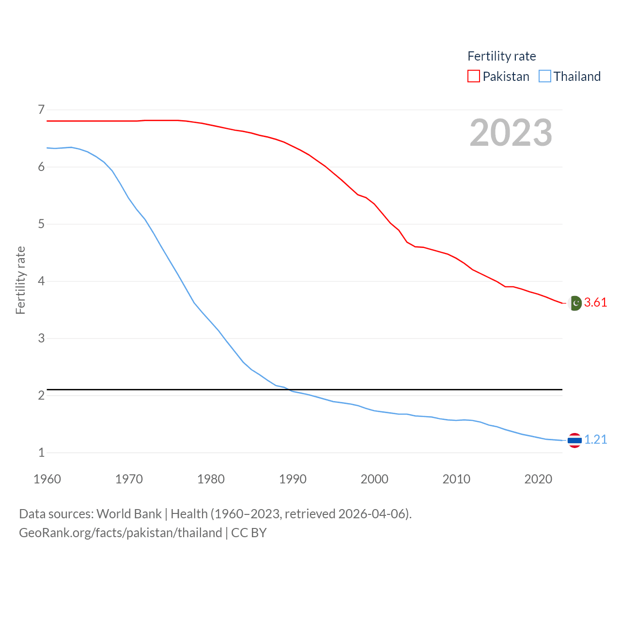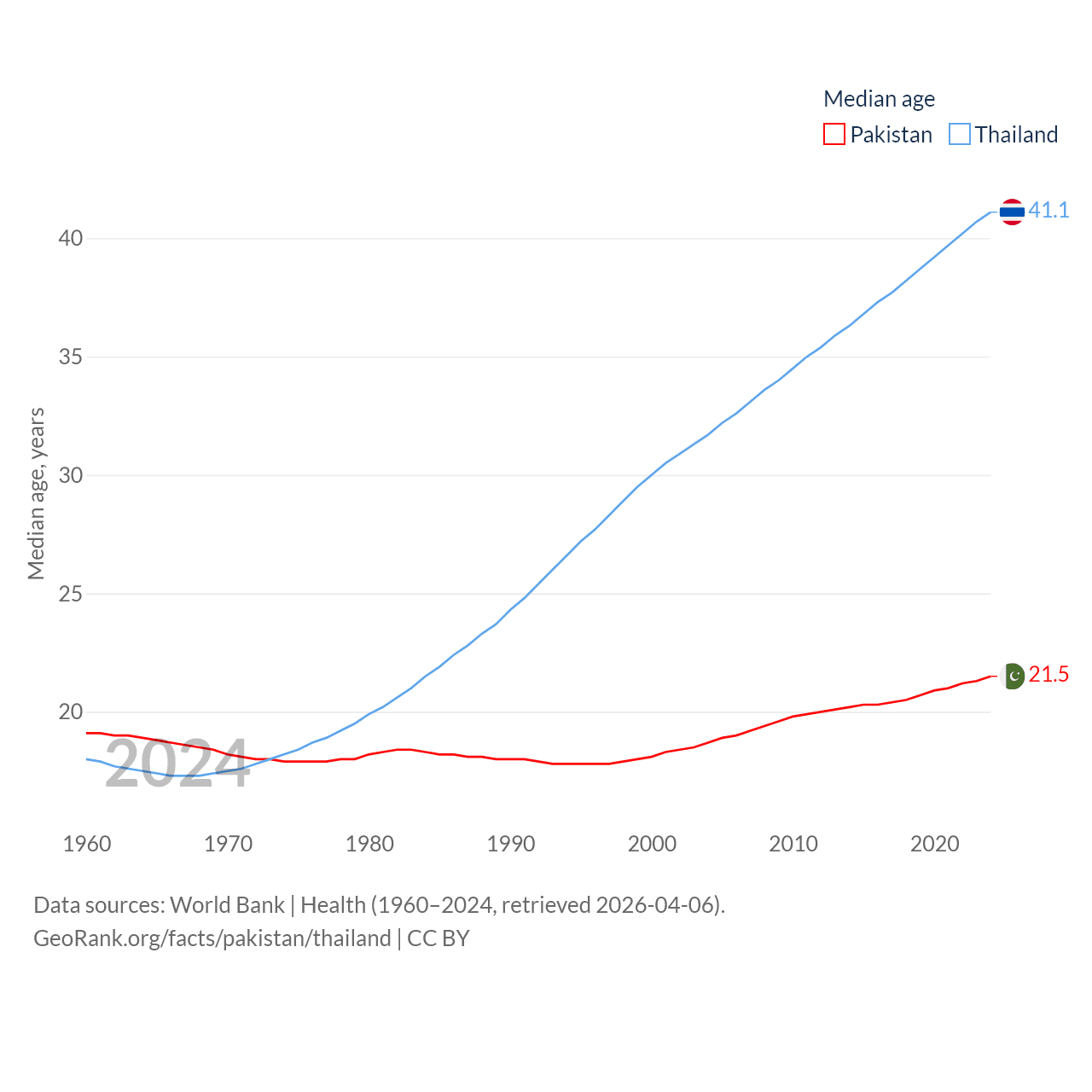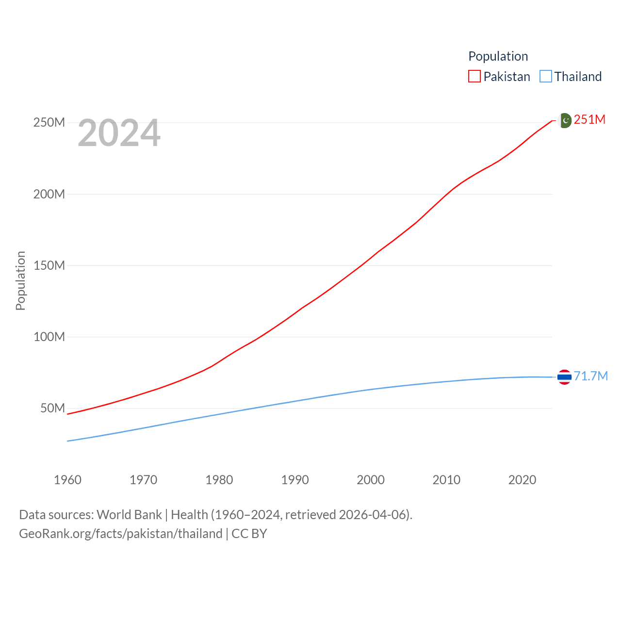 Pakistan has a population of 251M (ranked 5/197), compared with 71.7M in Thailand (ranked 20/197). Pakistan's land area is 297,638 sq mi versus 197,256 sq mi for Thailand (ranked 35th vs. 50th).