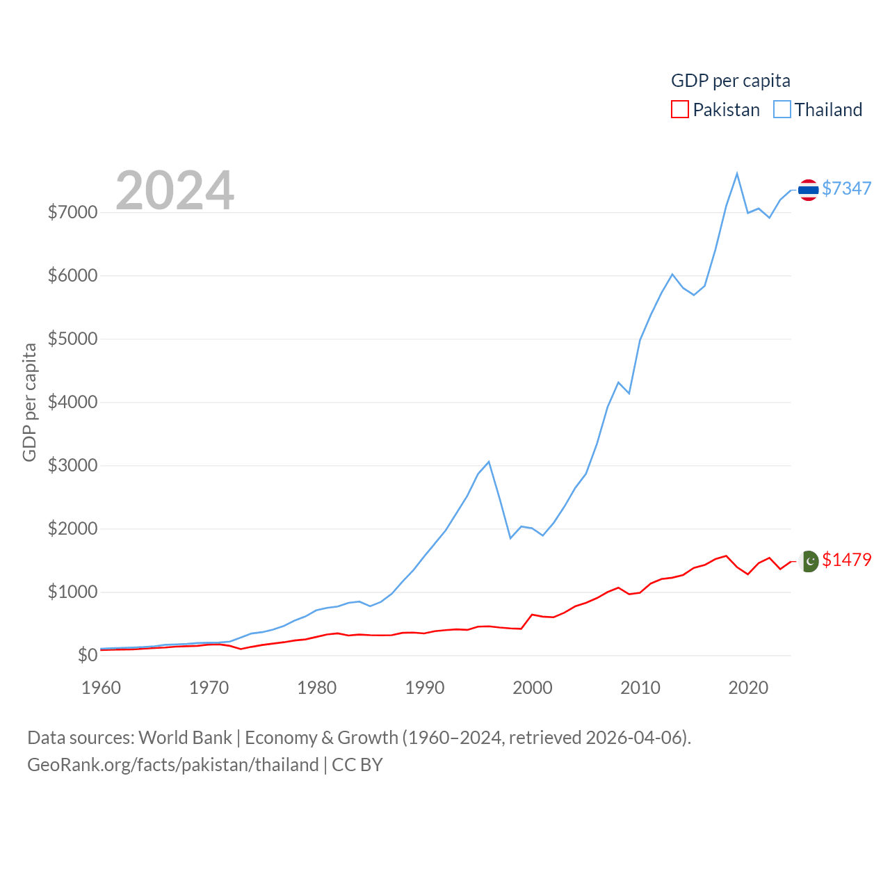 By GDP, Pakistan ranks 43/197 ($372B) and Thailand ranks 31/197 ($527B). By GDP per capita, Pakistan ranks 163/197 ($1,479), while Thailand ranks 100/197 ($7,347).