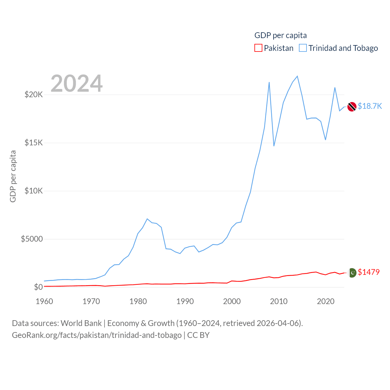 By GDP, Pakistan ranks 43/197 ($372B) and Trinidad and Tobago ranks 115/197 ($25.6B). By GDP per capita, Pakistan ranks 163/197 ($1,479), while Trinidad and Tobago ranks 61/197 ($18,733).