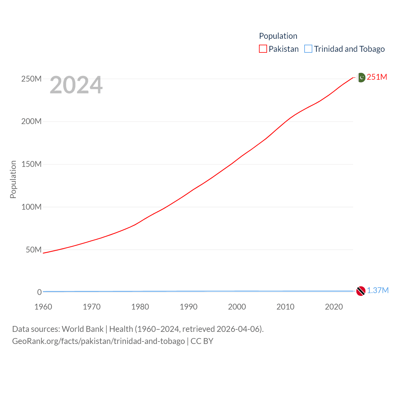 Pakistan has a population of 251M (ranked 5/197), compared with 1.37M in Trinidad and Tobago (ranked 154/197). Pakistan's land area is 297,638 sq mi versus 1,981 sq mi for Trinidad and Tobago (ranked 35th vs. 166th).