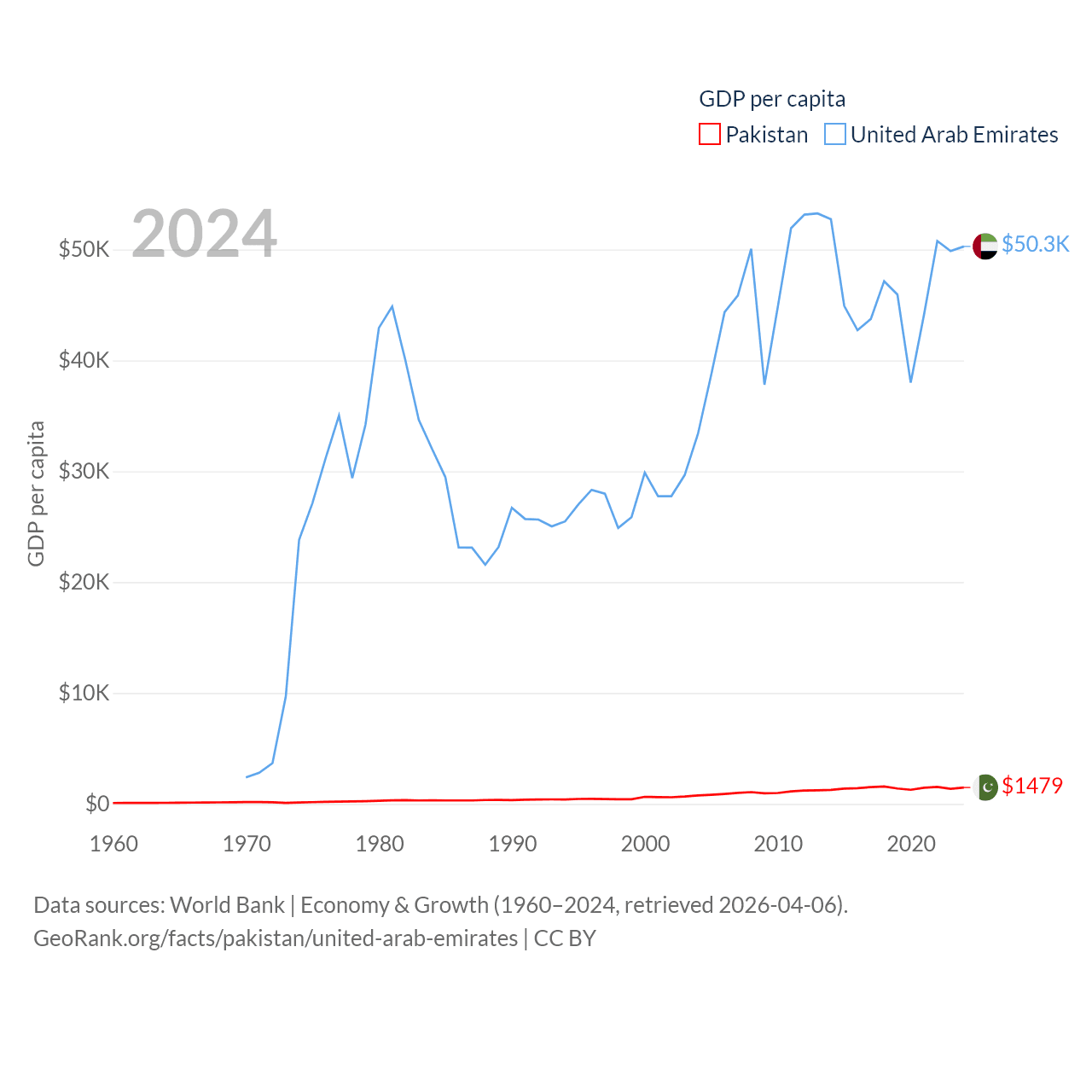 By GDP, Pakistan ranks 43/197 ($372B) and The United Arab Emirates ranks 27/197 ($552B). By GDP per capita, Pakistan ranks 163/197 ($1,479), while The United Arab Emirates ranks 24/197 ($50,274).
