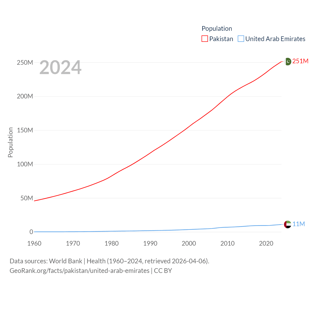 Pakistan has a population of 251M (ranked 5/197), compared with 11M in The United Arab Emirates (ranked 86/197). Pakistan's land area is 297,638 sq mi versus 27,421 sq mi for The United Arab Emirates (ranked 35th vs. 117th).
