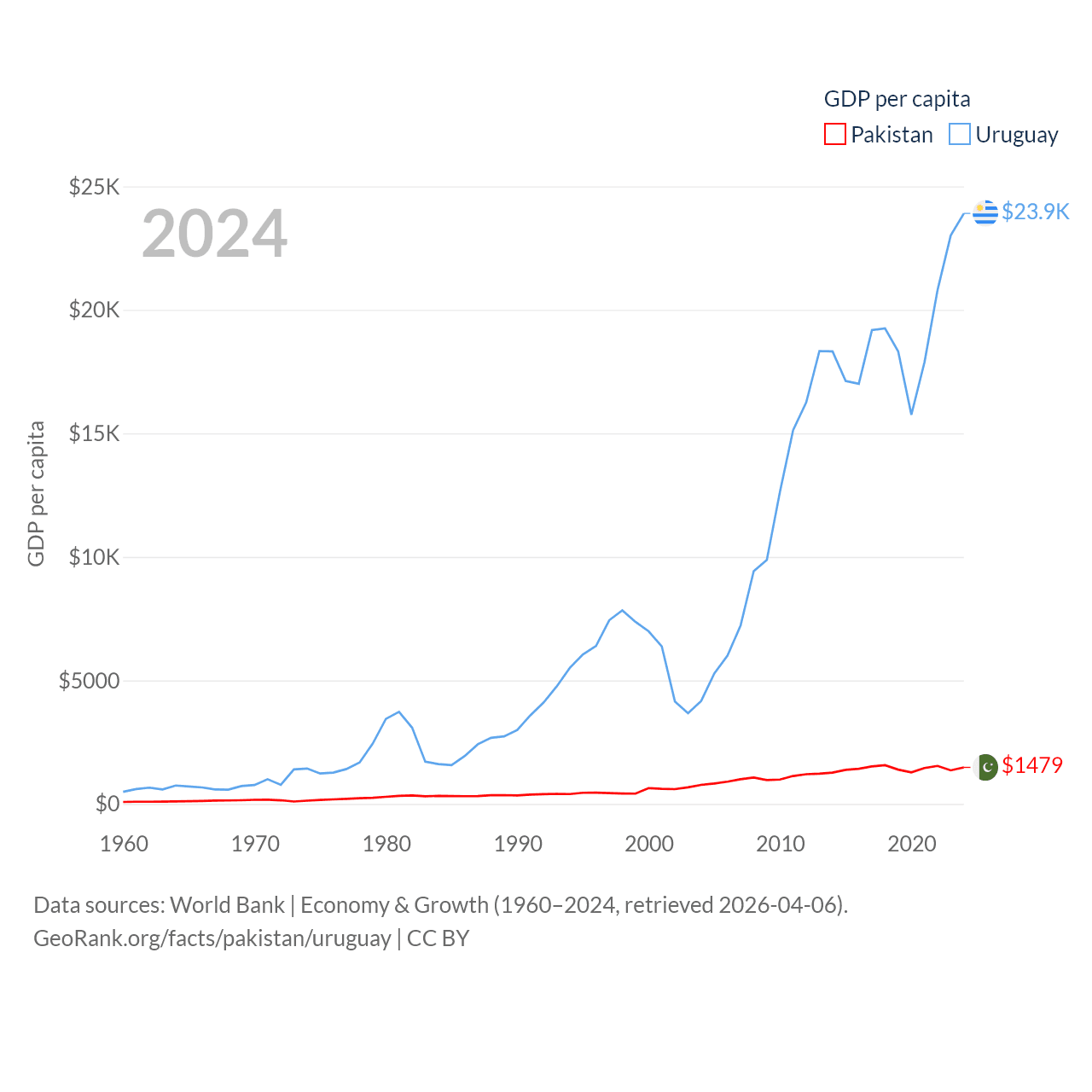 By GDP, Pakistan ranks 43/197 ($372B) and Uruguay ranks 81/197 ($81B). By GDP per capita, Pakistan ranks 163/197 ($1,479), while Uruguay ranks 52/197 ($23,907).