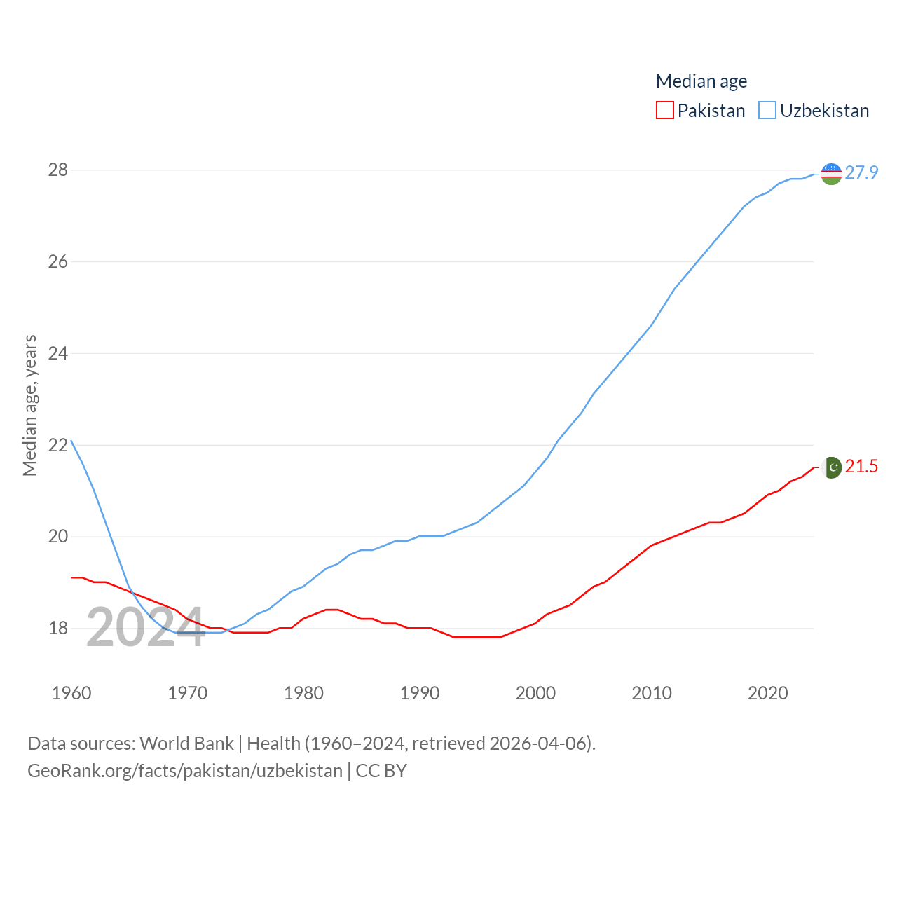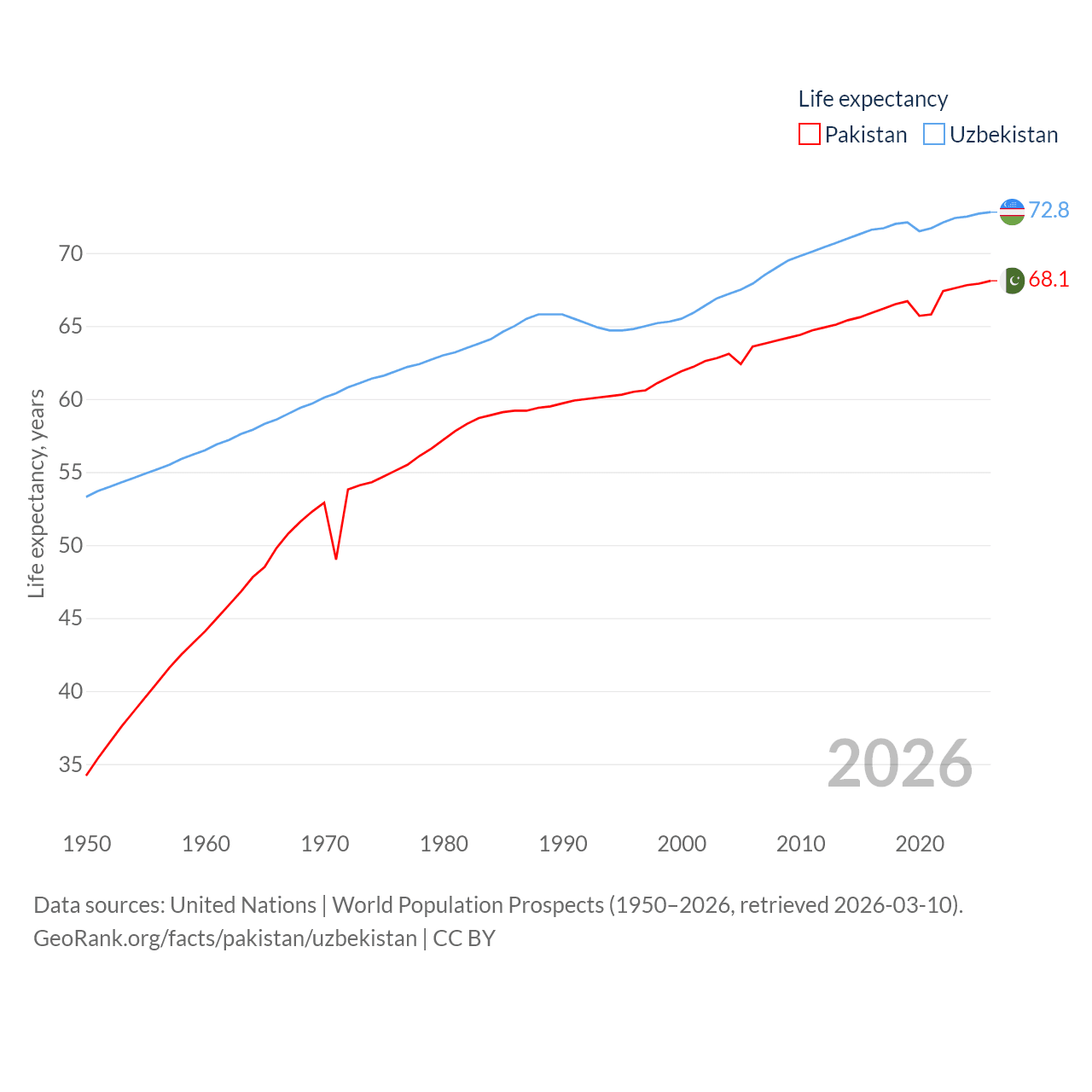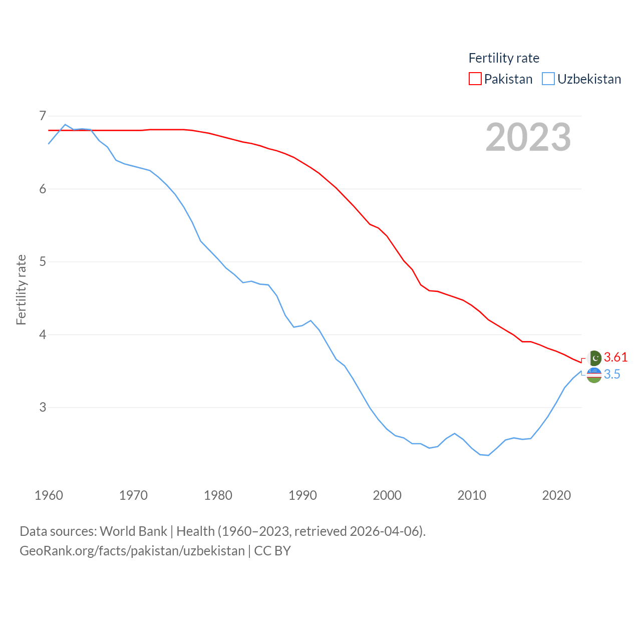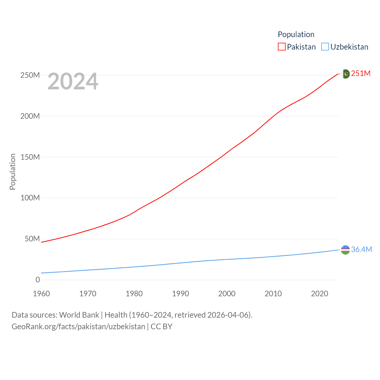 Pakistan has a population of 251M (ranked 5/197), compared with 36.4M in Uzbekistan (ranked 43/197). Pakistan's land area is 297,638 sq mi versus 170,136 sq mi for Uzbekistan (ranked 35th vs. 56th).