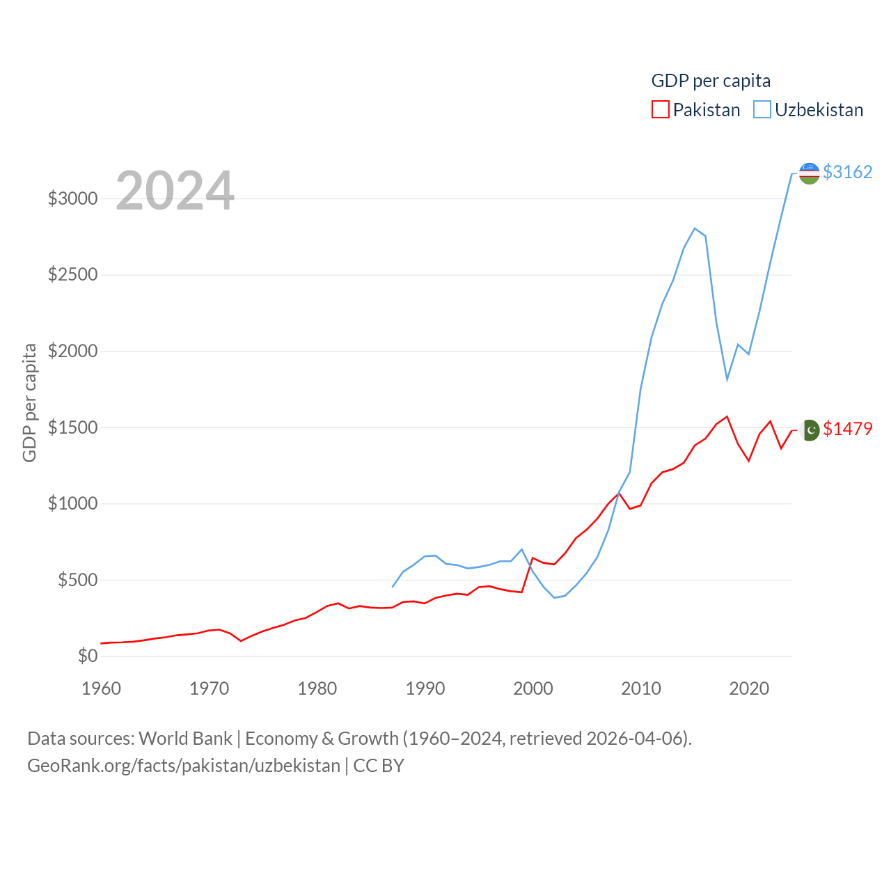 By GDP, Pakistan ranks 43/197 ($372B) and Uzbekistan ranks 66/197 ($115B). By GDP per capita, Pakistan ranks 163/197 ($1,479), while Uzbekistan ranks 139/197 ($3,162).