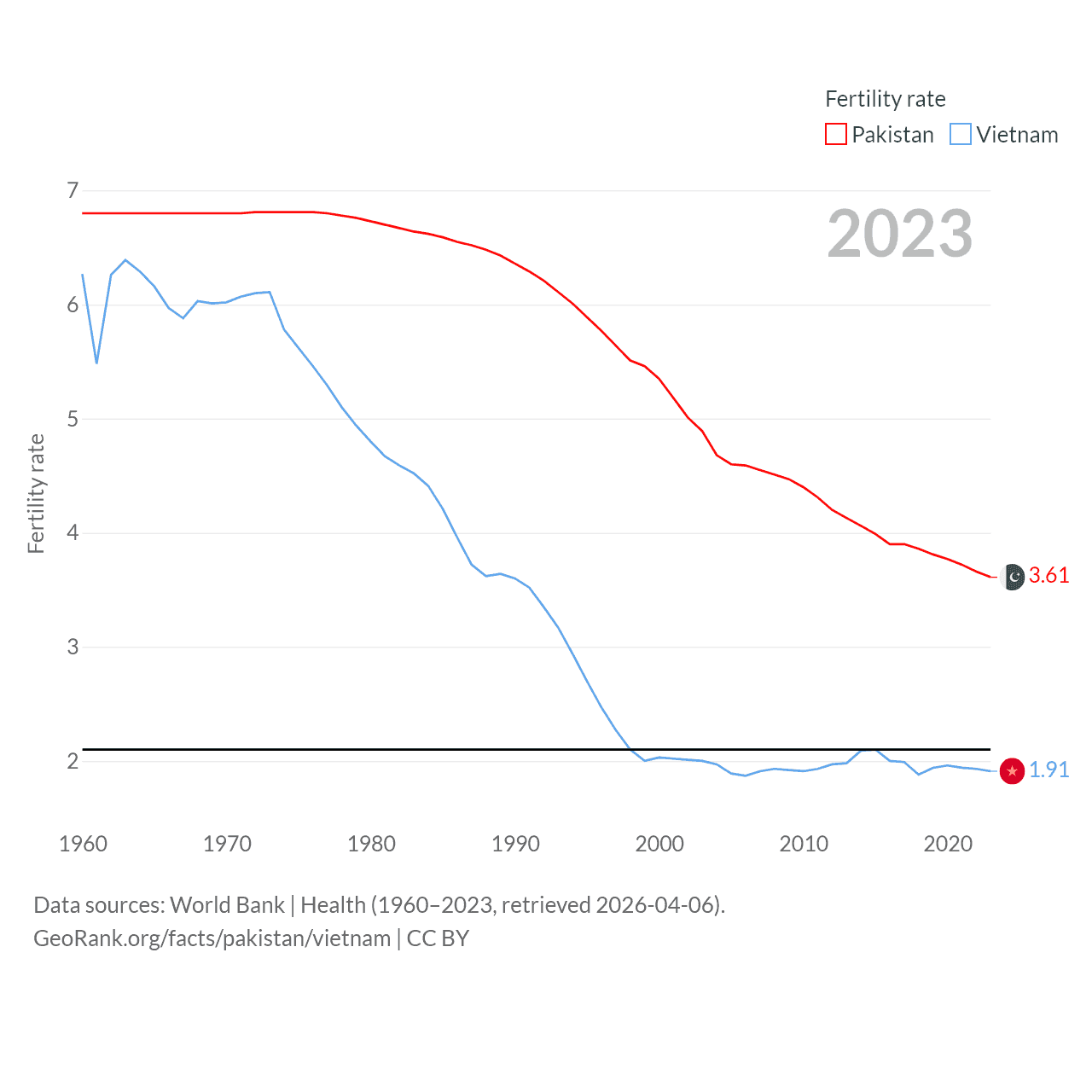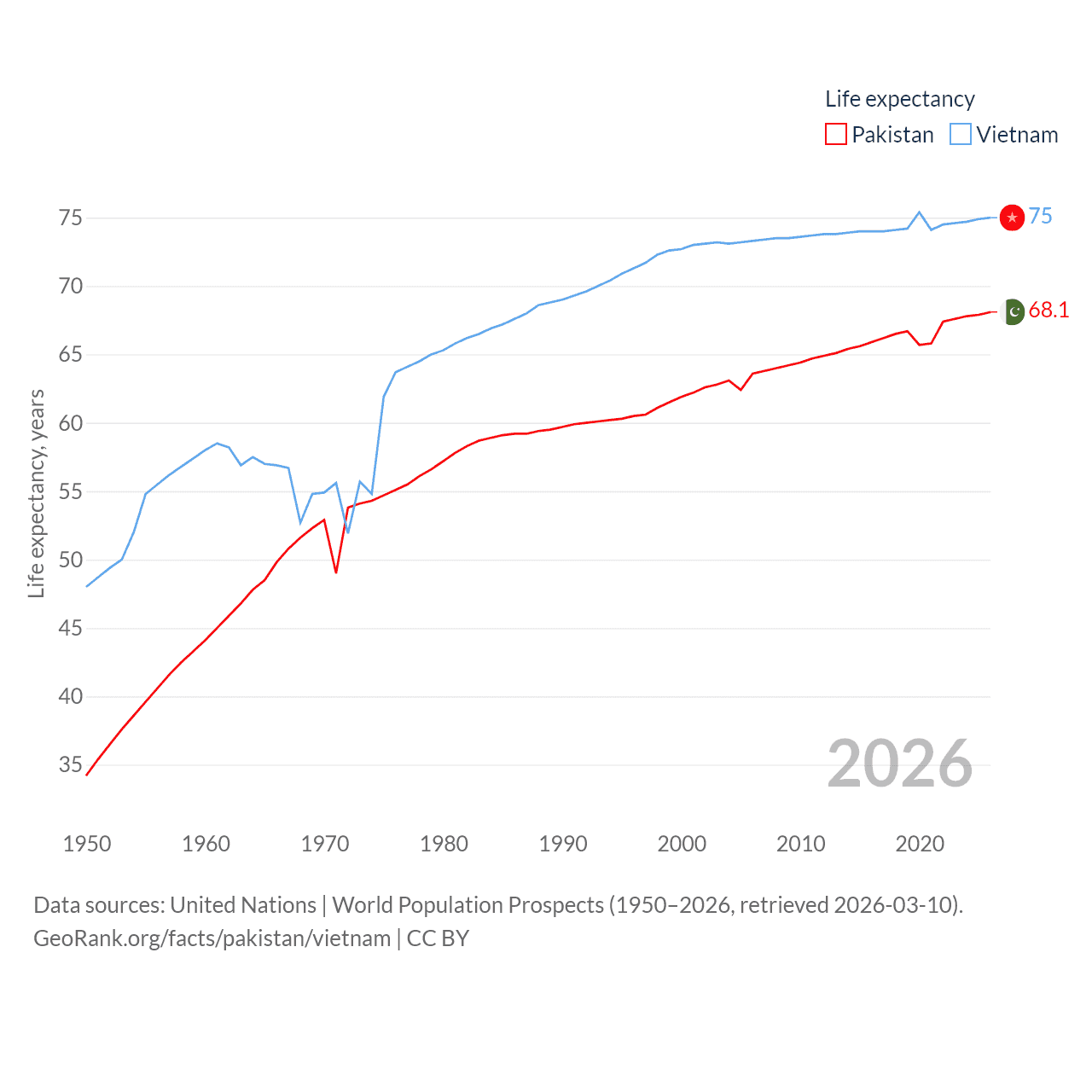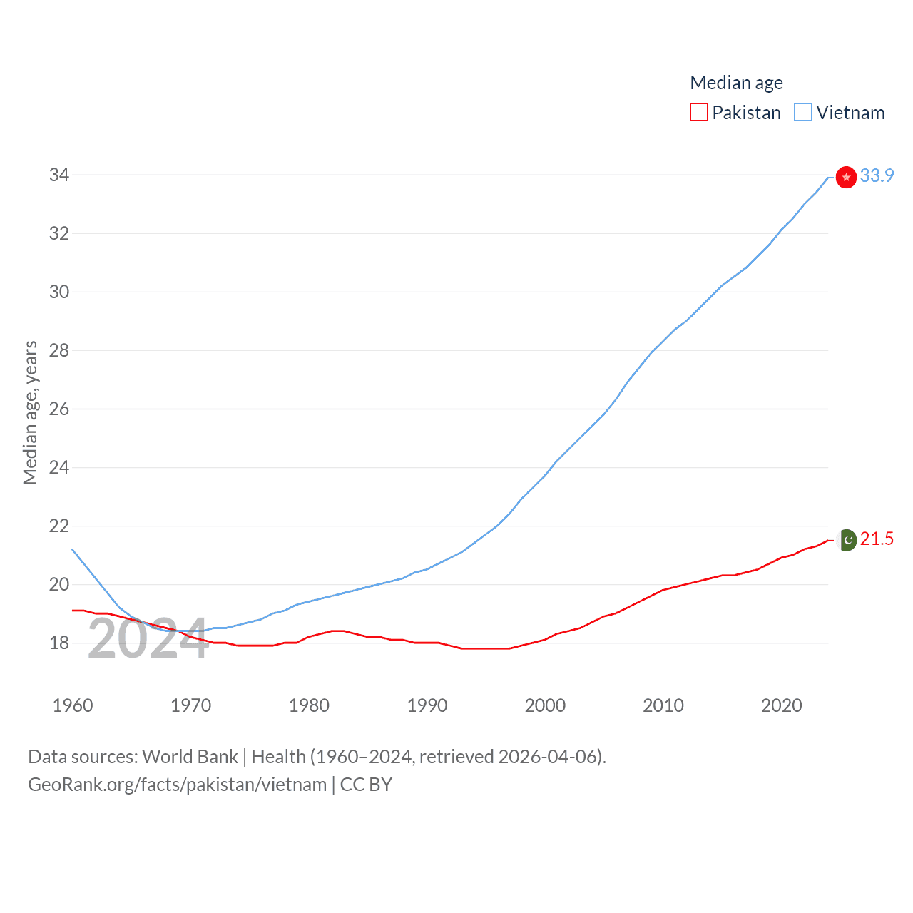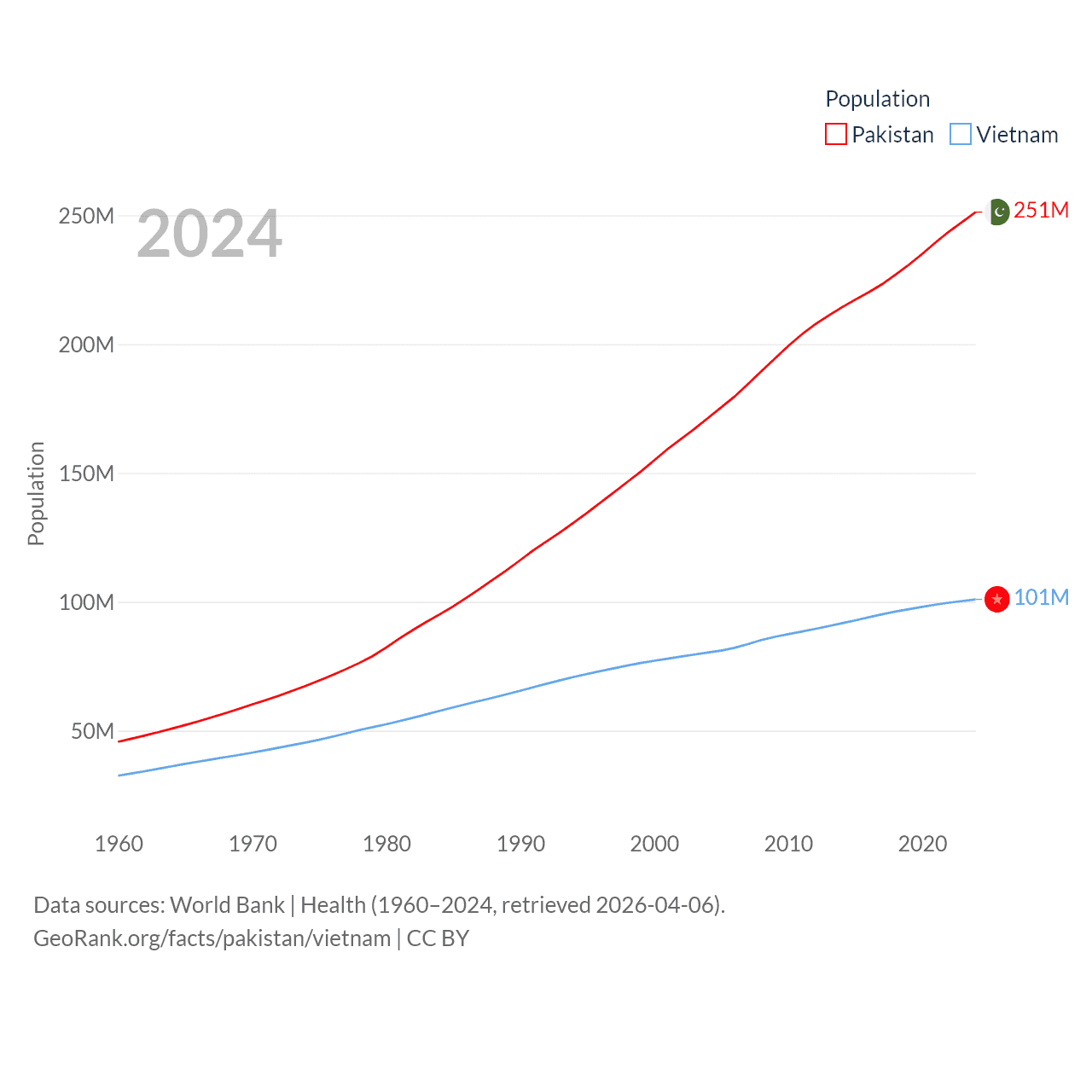 Pakistan has a population of 251M (ranked 5/197), compared with 101M in Vietnam (ranked 16/197). Pakistan's land area is 297,638 sq mi versus 121,016 sq mi for Vietnam (ranked 35th vs. 67th).