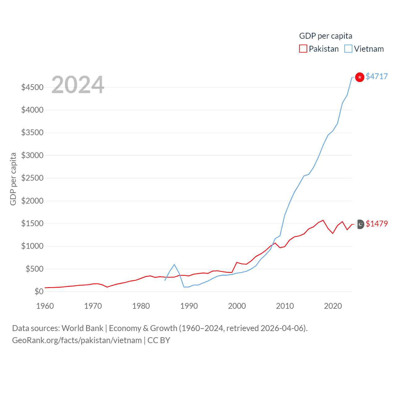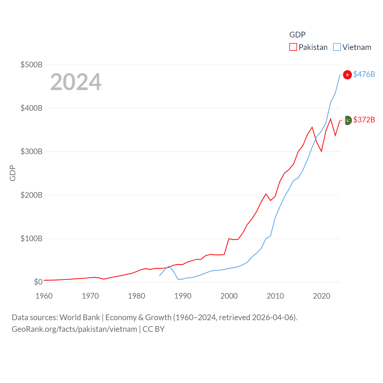 By GDP, Pakistan ranks 43/197 ($372B) and Vietnam ranks 33/197 ($476B). By GDP per capita, Pakistan ranks 163/197 ($1,479), while Vietnam ranks 122/197 ($4,717).