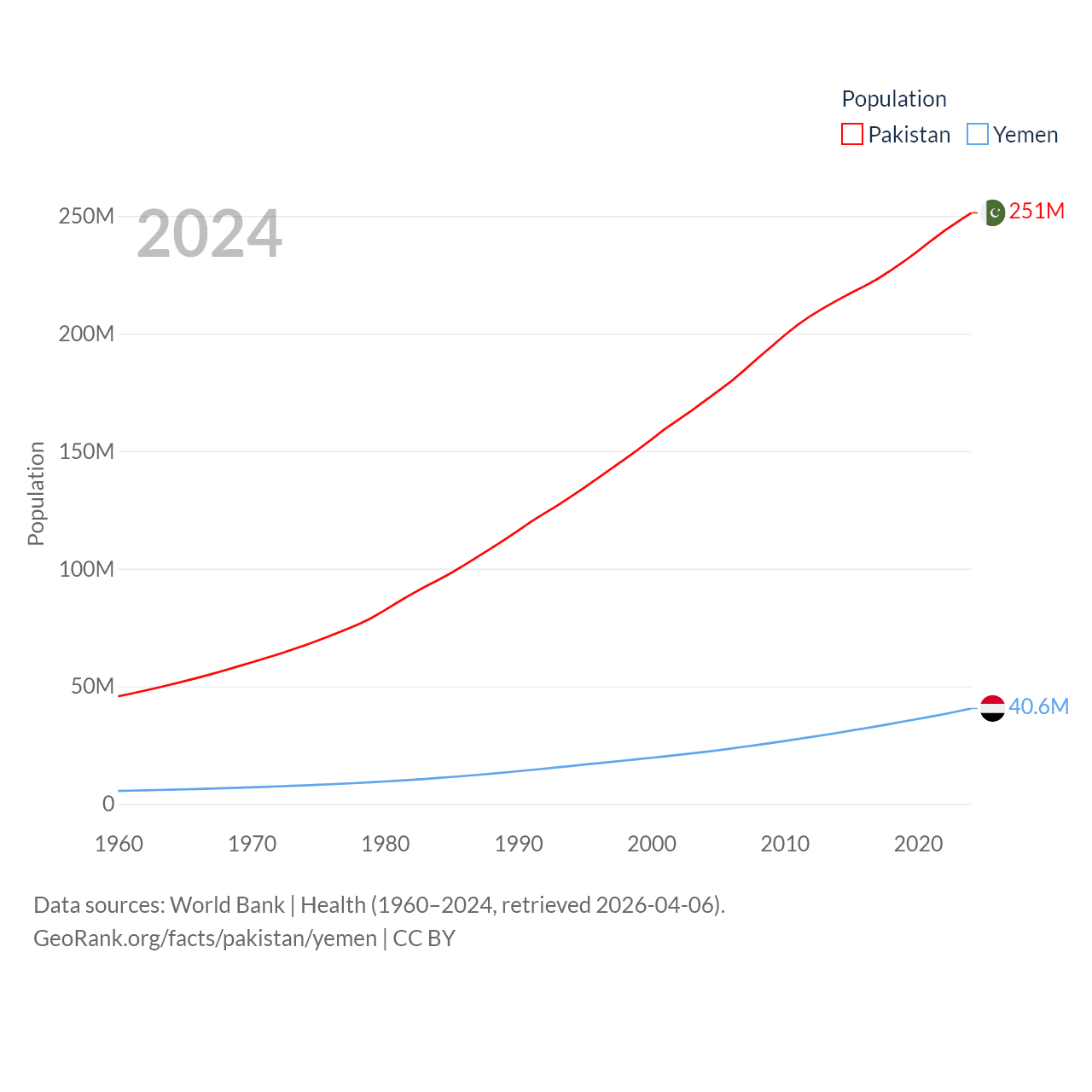 Pakistan has a population of 251M (ranked 5/197), compared with 40.6M in Yemen (ranked 38/197). Pakistan's land area is 297,638 sq mi versus 203,850 sq mi for Yemen (ranked 35th vs. 49th).