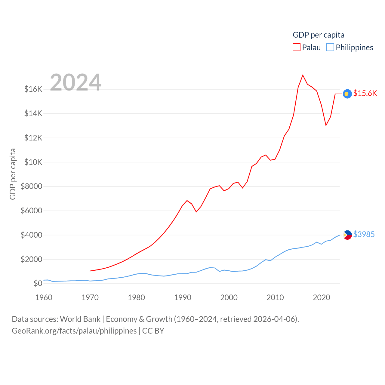 By GDP, Palau ranks 194/197 ($277M) and The Philippines ranks 35/197 ($462B). By GDP per capita, Palau ranks 67/197 ($15,611), while The Philippines ranks 130/197 ($3,985).