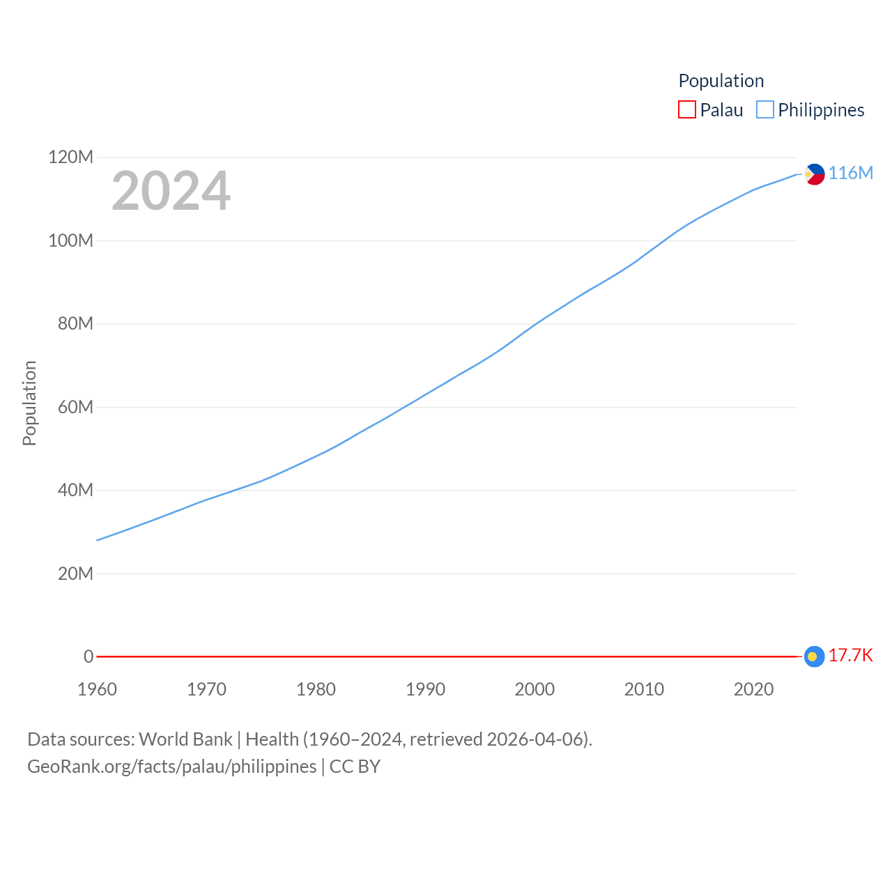 Palau has a population of 17.7K (ranked 194/197), compared with 116M in The Philippines (ranked 14/197). Palau's land area is 177.6 sq mi versus 115,124 sq mi for The Philippines (ranked 180th vs. 71st).