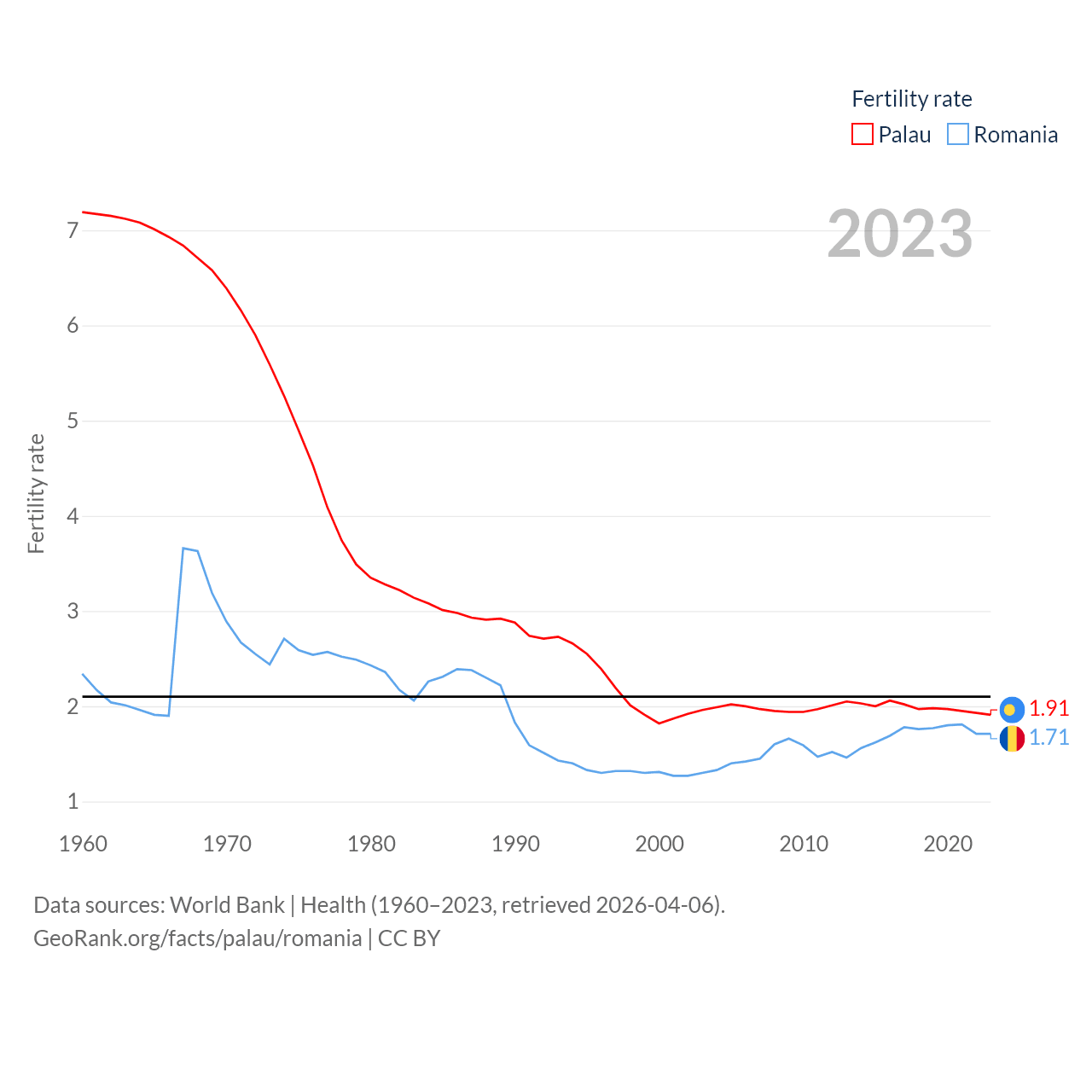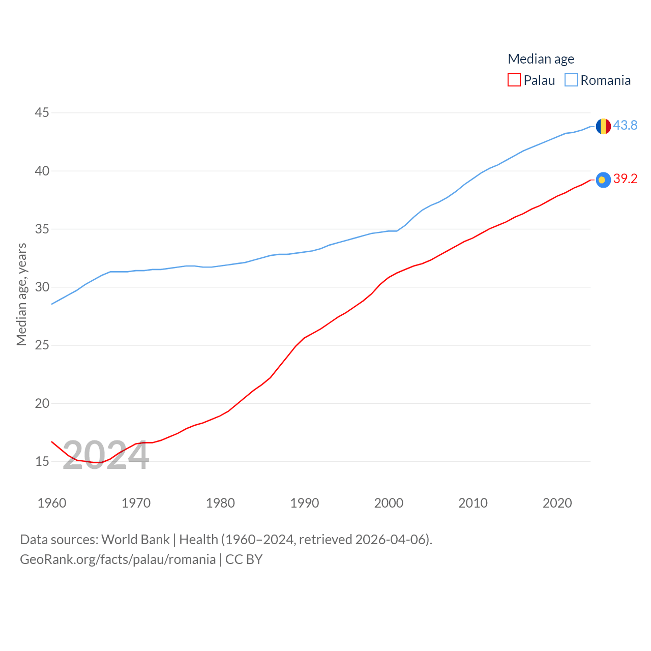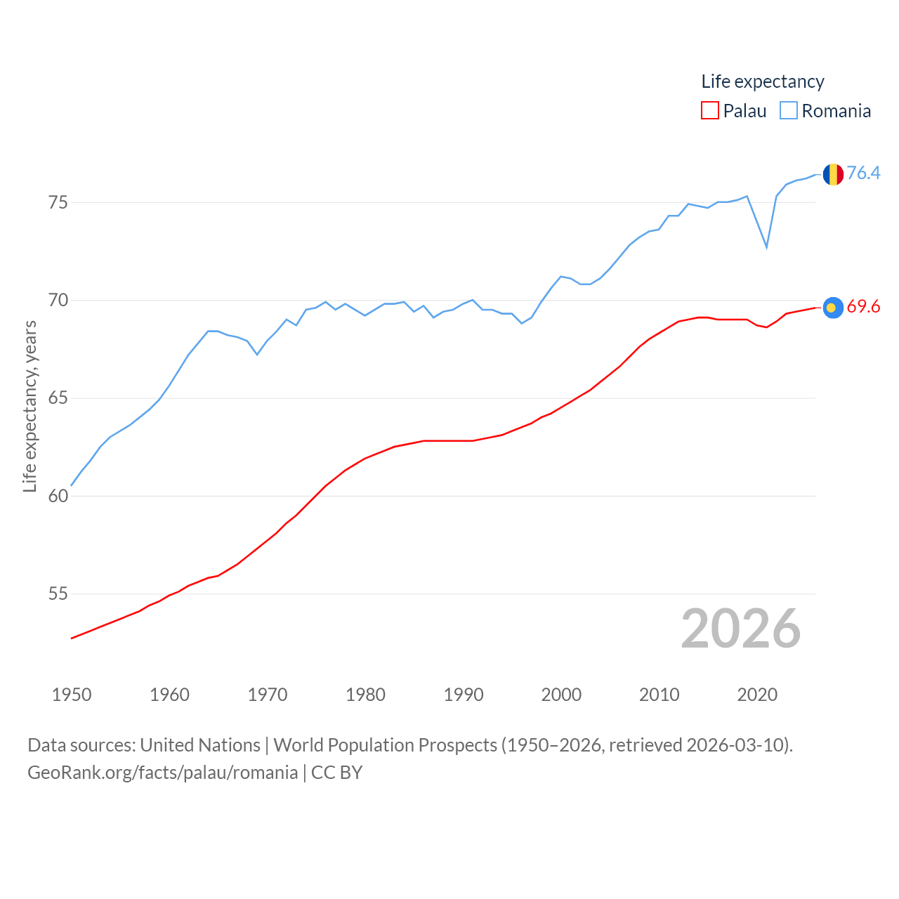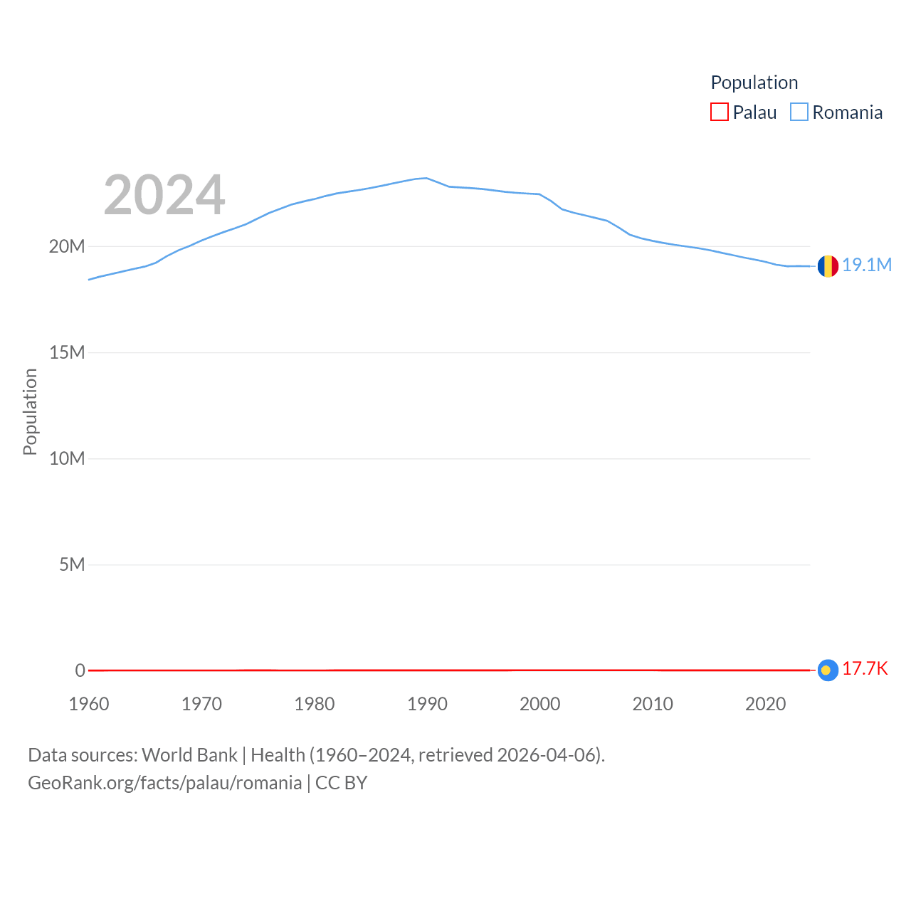Palau has a population of 17.7K (ranked 194/197), compared with 19.1M in Romania (ranked 67/197). Palau's land area is 177.6 sq mi versus 88,834 sq mi for Romania (ranked 180th vs. 80th).
